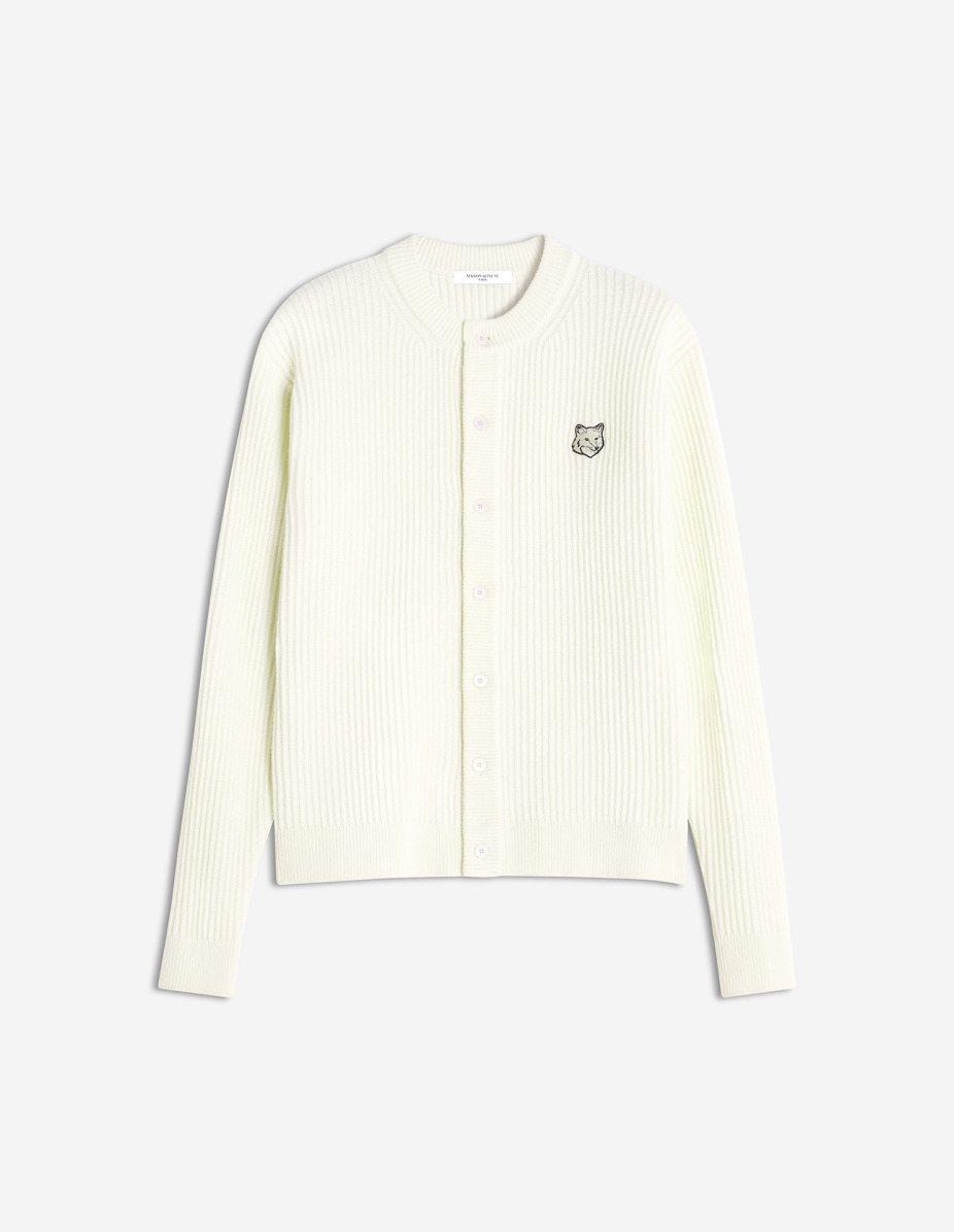 DETAILS Ribbed wool cardigan. Regular fit with Fox Head embroidered patch. - Ribbed wool cardigan - Regular fit - Crew neck - Maison Kitsune engraved button closure - Long sleeves - Rib finishing at the neckline, cuffs and hem - Ribbed knit - Tonal Fox Head embroidered patch on the chest PM00508KT1149-P700 SIZE & CUT Cut: REGULAR Sizing: MEN The male model is 6.2 and is wearing size M MATERIAL 100% WOOL TRACEABILITY Made in Italy