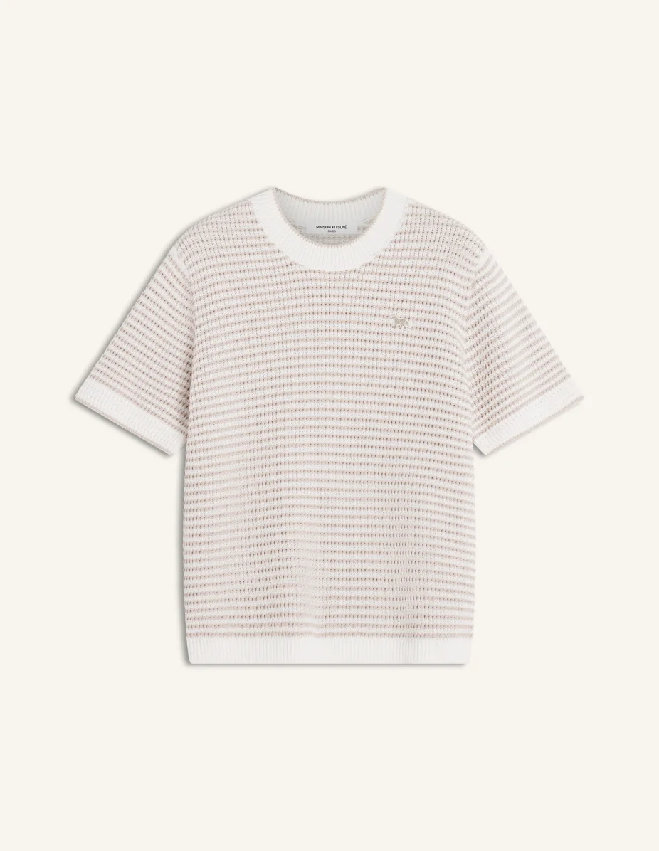 DETAILS Short sleeve jumper in striped pointelle cotton knit. Fitted cut with Baby Fox embroidered patch on the chest. - Short sleeve jumper in striped pointelle cotton - Delicate knit with crochet-effect stitch and cord-like yarn for a soft, feminine look - Fitted cut - Crew neck - Tonal Baby Fox embroidered patch on the chest - Ribbing at the neckline, arms, and hem QW00804KT1206-0509 SIZE & CUT Cut: FITTED Sizing: WOMEN The female model is 5.8 tall and wears a size S MATERIAL 94% COTTON, 6% POLYAMIDE TRACEABILITY Made in China