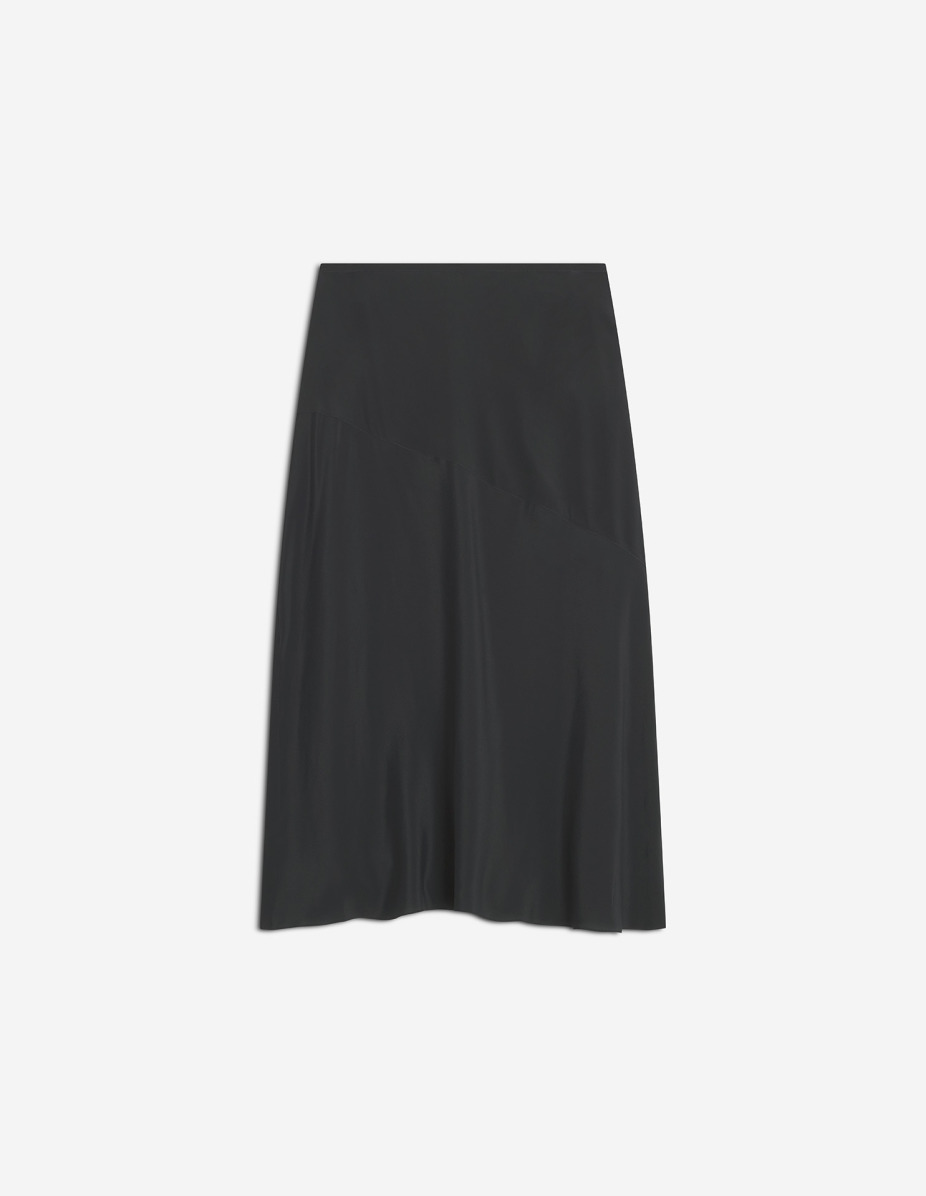 DETAILS Long slip skirt in silk-blend crepe de Chine. - Flowing long skirt in a silk blended crepe de Chine - Maxi length - Slim set-on waistband - Invisible side zip closure PW01509WF4052-P199 SIZE & CUT Cut: LONG Sizing: WOMEN The female model is 5.7 and is wearing size 36 MATERIAL 68% ACETATE, 32% SILK TRACEABILITY Made in Bulgaria