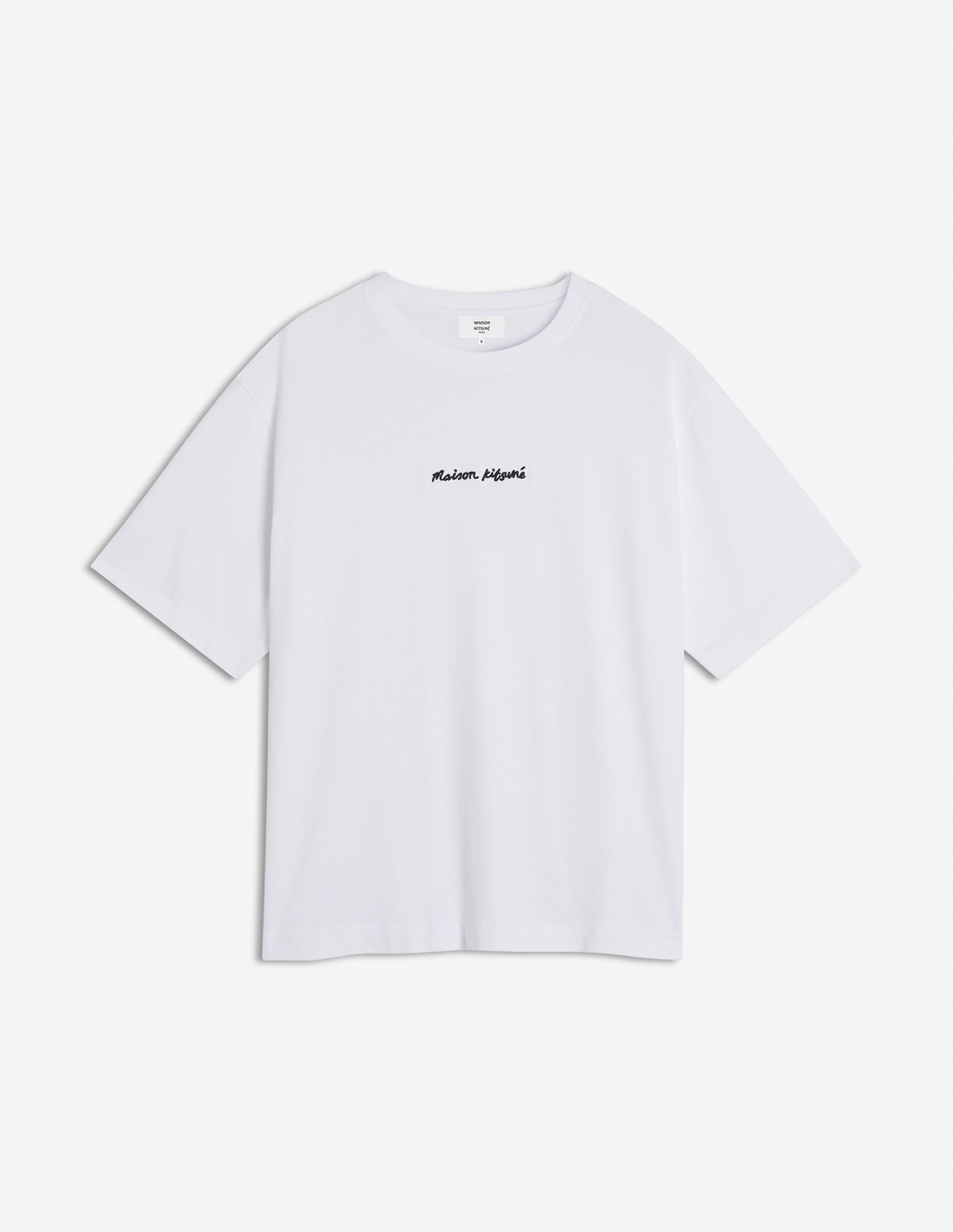 DETAILS T-shirt in cotton jersey (240g) with short sleeves. Oversize fit with Maison Kitsune Handwriting signature embroidered. - T-shirt in cotton jersey (240g) - Organic cotton - Oversize fit - Short sleeves - Crew neck with rib finishing - Maison Kitsune Handwriting signature embroidered on the chest OM00122KJ0119-P100 SIZE & CUT Cut: OVERSIZE Sizing: MEN The male model is 6.1 and is wearing size M MATERIAL 100% COTTON TRACEABILITY Made in Portugal