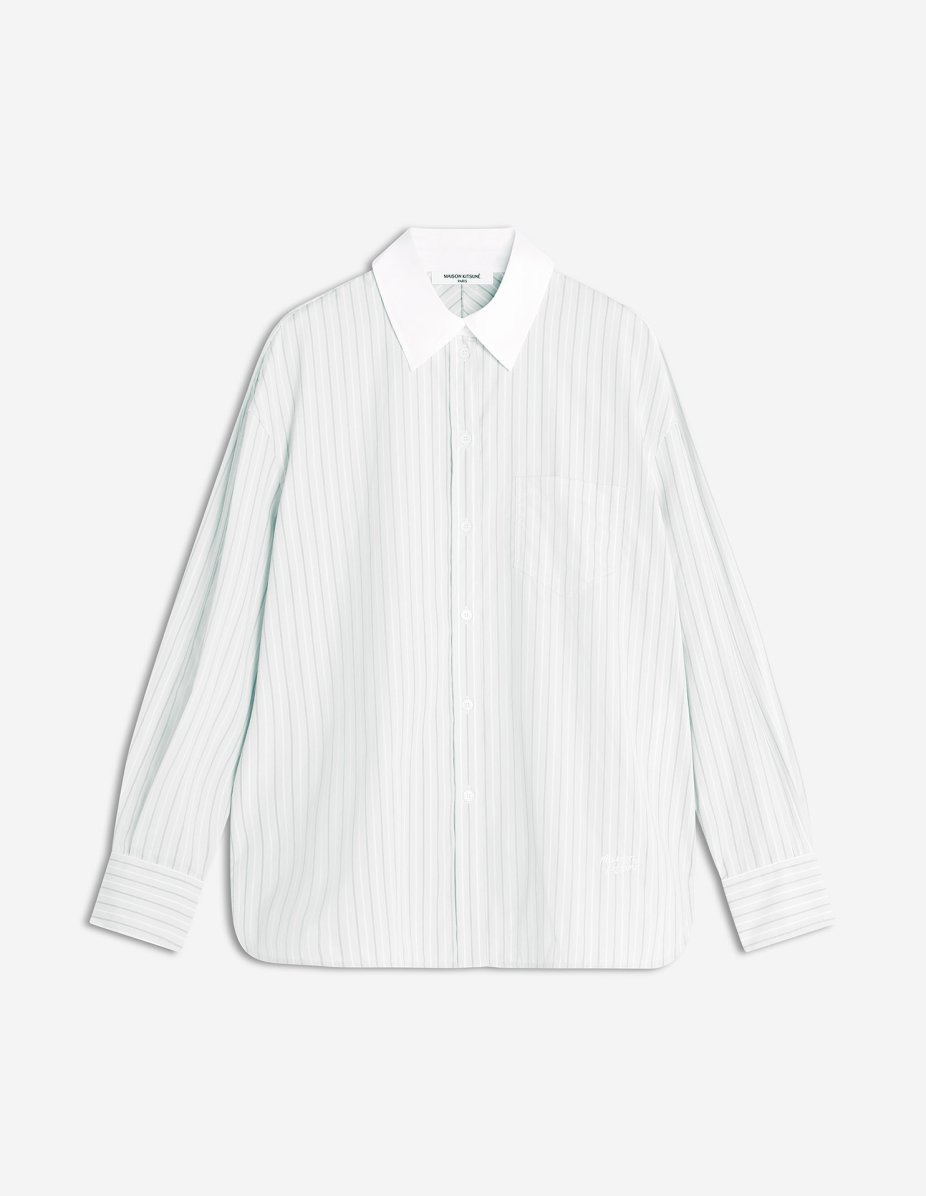 DETAILS Boyfriend shirt in cotton poplin with fine stripes. Comfort fit, contrasted collar, Maison Kitsune Handwriting signature embroidered. - Casual cotton poplin shirt with fine stripes - Comfort fit - Mid-length raglan sleeves finished with pleated cuffs - Engraved button closure - Contrasted white classic collar - Chest patch pocket - Maison Kitsune Handwriting signature embroidered at the bottom left PW00416WC5063-P181 SIZE & CUT Cut: COMFORT Sizing: WOMEN The female model is 5.7 and is wearing size 36 MATERIAL Main Material: 100% COTTON, Collar: 100% COTTON TRACEABILITY Made in Portugal