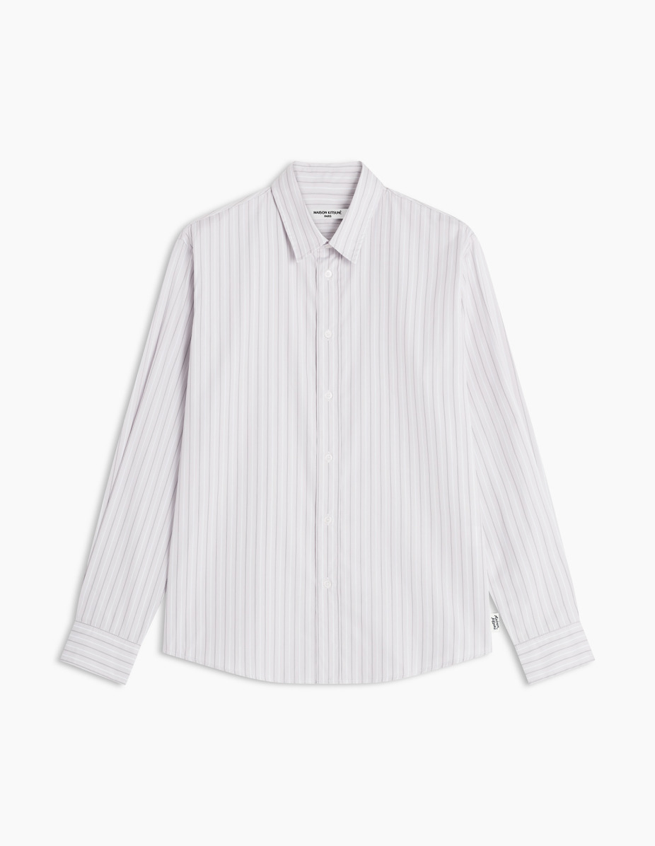 DETAILS Casual cotton poplin shirt with fine stripes. Comfort fit with embroidered Maison Kitsune Handwriting signature. - Casual cotton poplin shirt with fine stripes - Casual fit - Classic collar - Maison Kitsune engraved button closure - Maison Kitsune Handwriting tag sewn on the side seam - Long sleeves with buttoned straight cuffs - Rounded hem PM00412WC5063-P181 SIZE & CUT Cut: COMFORT Sizing: MEN The male model is 6.1 and is wearing size M MATERIAL 100% COTTON TRACEABILITY Made in Portugal
