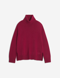 DETAILS Thick merino wool turtleneck jumper. Embroidered Maison Kitsune Handwriting signature. - Thick merino wool jumper - Comfort fit - Turtleneck - Long sleeves - Rib finishing at collar, cuffs and hem - Slits at the bottom for more ease - Heavy-gauge knit - Tonal Maison Kitsune Handwriting signature embroidered at the bottom left PW00813KT1171-0143 SIZE & CUT Cut: COMFORT Sizing: WOMEN The female model is 5.7 and is wearing size S MATERIAL 100% WOOL TRACEABILITY Made in China