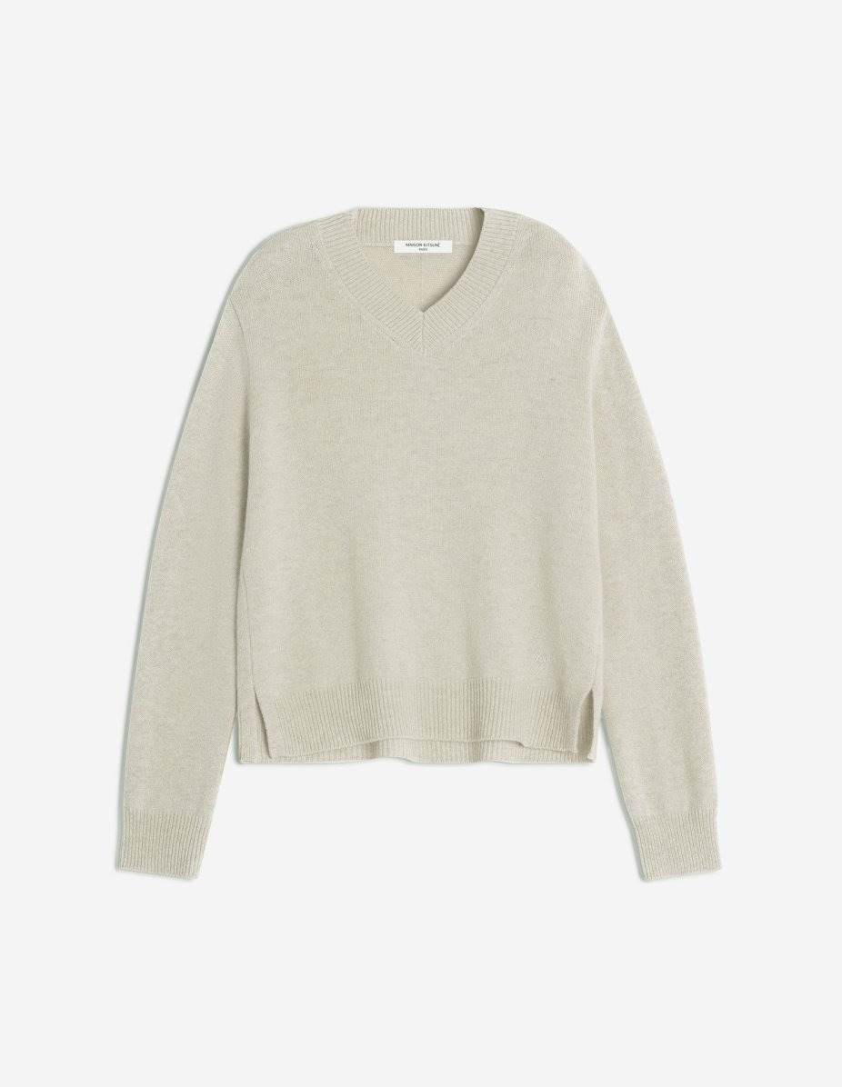 DETAILS Thick merino wool jumper with V-neck, comfort fit, Maison Kitsune Handwriting signature embroidery. - Chunky merino wool jumper - Comfort fit, generouse volume easy to layer - V neck - Long sleeves - Rib finishing at neckline, cuffs and hem - High-gauge knit - Tonal Maison Kitsune Handwriting signature embroidered at the bottom left PW00815KT1171-H218 SIZE & CUT Cut: COMFORT Sizing: WOMEN The female model is 5.7 and is wearing size S MATERIAL 100% WOOL TRACEABILITY Made in China