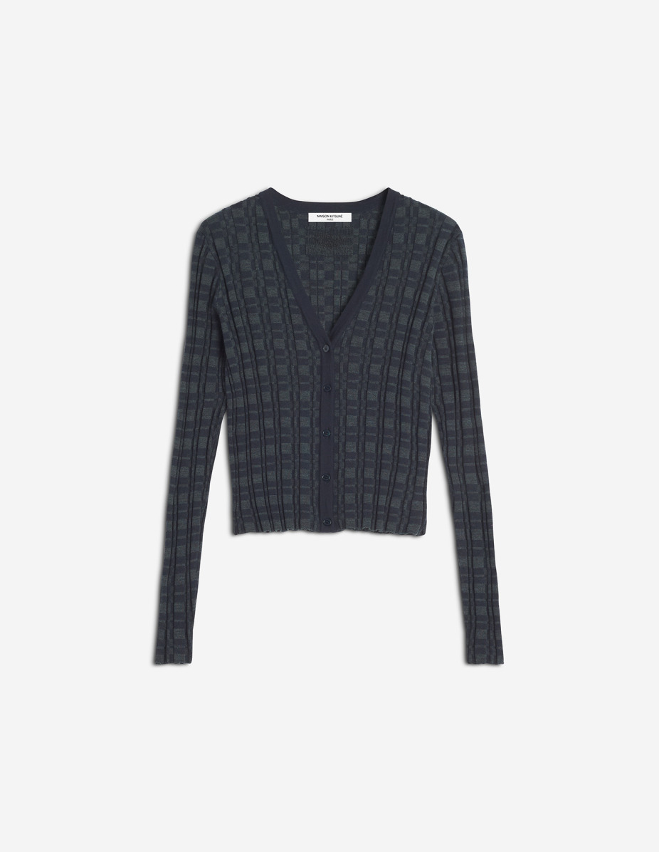 DETAILS Cardigan in ribbed merino wool check. - Merino wool ribbed cardigan with check pattern - Fitted fit - V-neck - Maison Kitsune engraved button closure - Long sleeves - Rib finishing at the neckline, cuffs and hem - Tonal Maison Kitsune Handwriting signature embroidered at the back PW00510KT1170-0379 SIZE & CUT Cut: FITTED Sizing: WOMEN The female model is 5.7 and is wearing size S MATERIAL 100% WOOL TRACEABILITY Made in China
