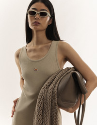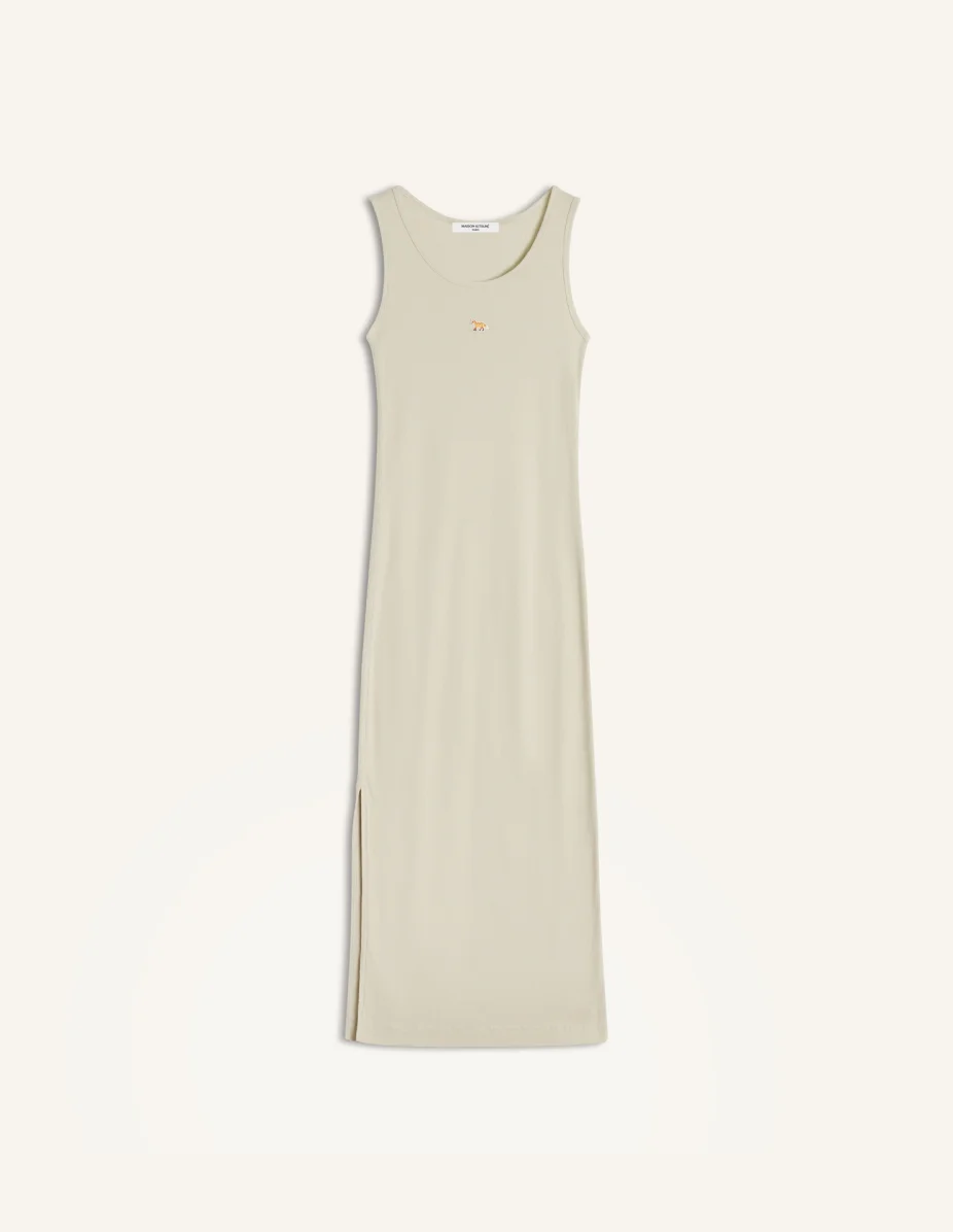 DETAILS Long tank dress in cotton classic rib. Fitted cut with Baby Fox embroidered patch on the chest. - Ribbed cotton tank dress - Long fit - Round neckline - Sleeveless - Slit on the right side for ease - Baby Fox embroidered patch on the chest QW01654KA0033-0450 SIZE & CUT Cut: LONG Sizing: WOMEN The female model is 5.8 tall and wears a size S MATERIAL 100% ORGANIC COTTON TRACEABILITY Made in Portugal