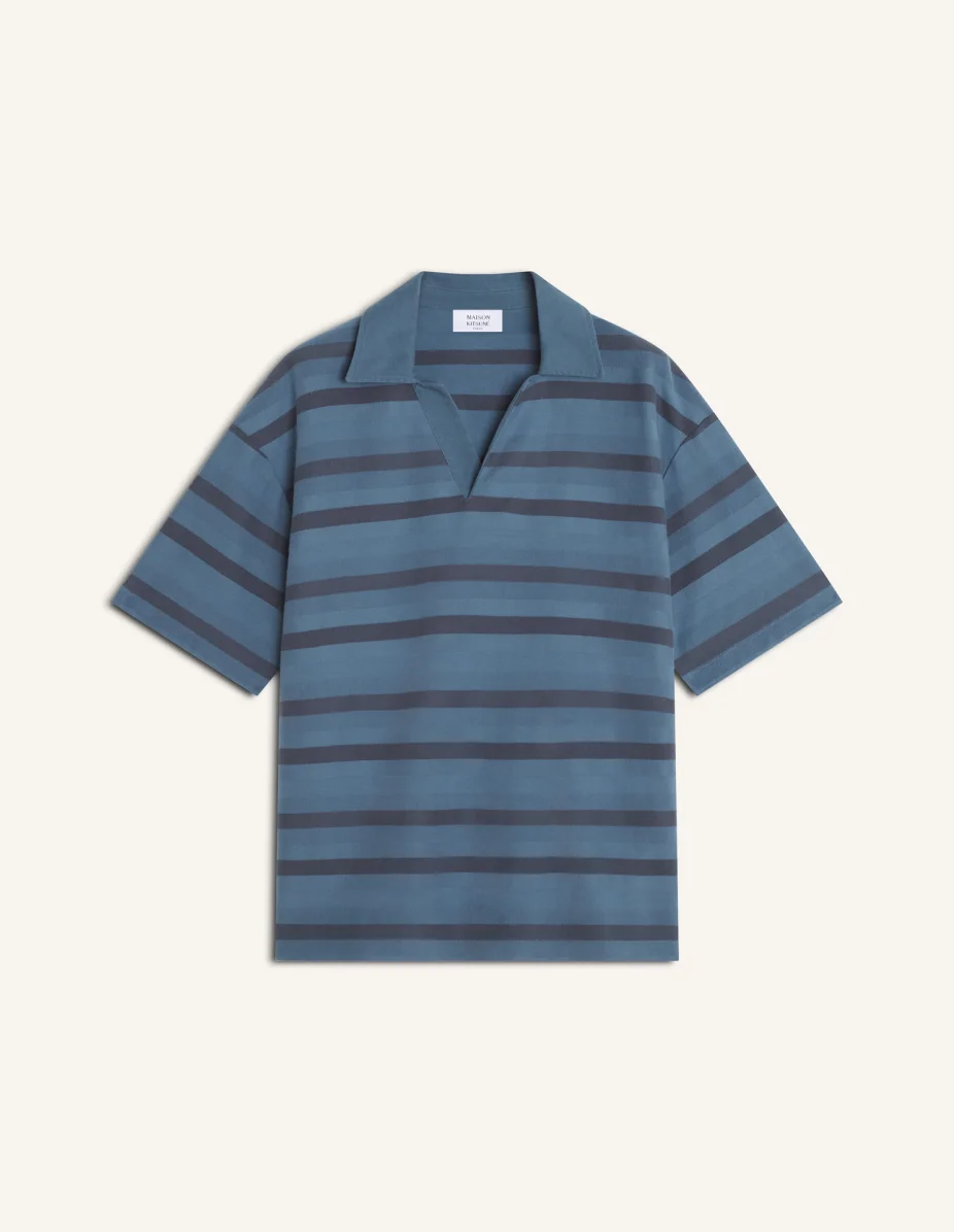 DETAILS Oversized striped polo in cotton jacquard. Maison Kitsune Paris woven label at the back neckline. - Short sleeve polo in striped cotton jacquard - Oversize fit - Open polo collar - Maison Kitsune Paris woven label at the back neckline QM00204KA0039-0513 SIZE & CUT Cut: OVERSIZE Sizing: MEN The male model is 6.1 tall and wears a size S MATERIAL Collar: 100% ORGANIC COTTON, 100% ORGANIC COTTON TRACEABILITY Made in Portugal