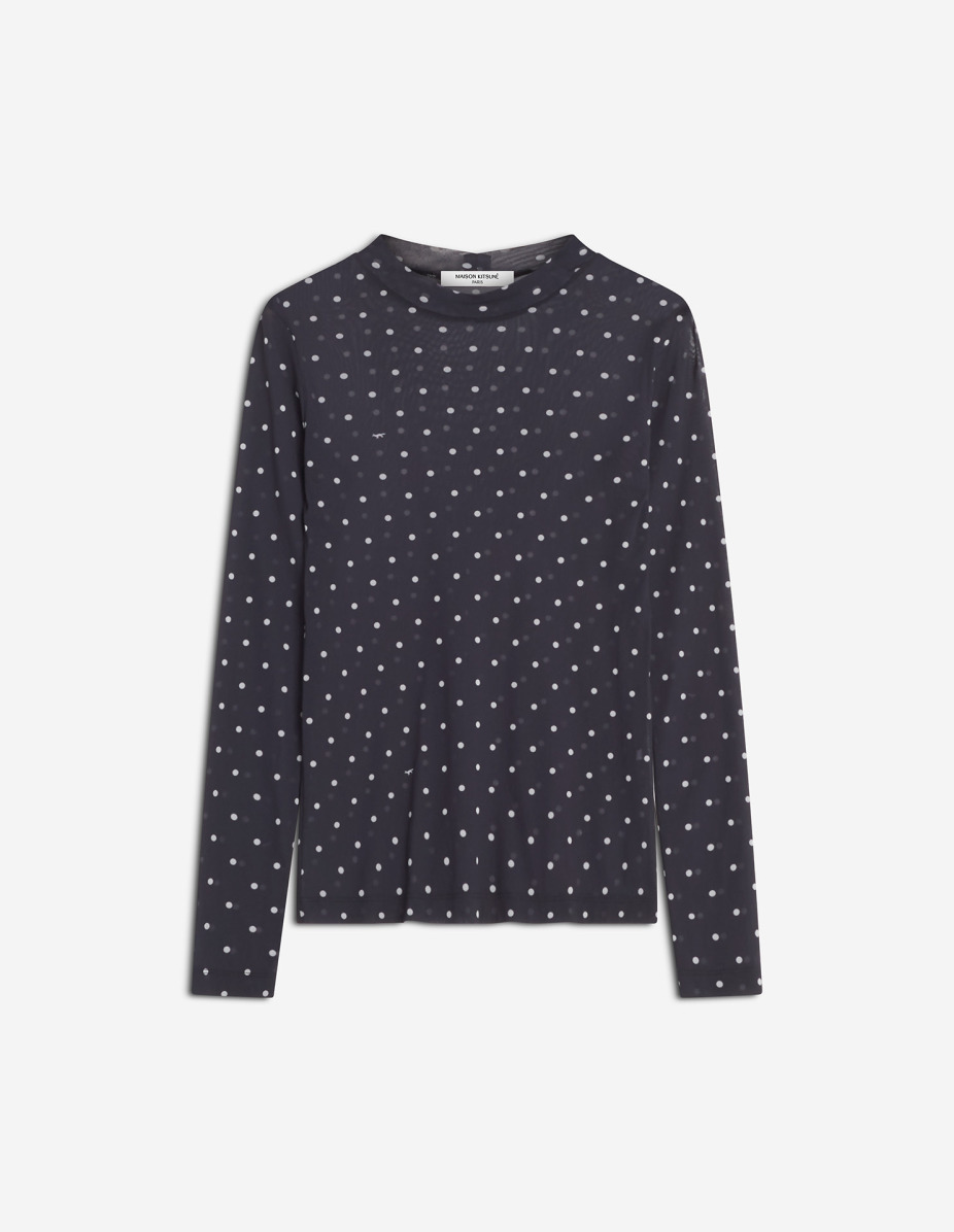DETAILS Fitted mesh top, crew neck, all-over Polka Dot Fox print. - Transparent printed mesh top - Fitted fit - Long sleeves - Crew neck - All-over Polka Dot Fox print PW00621KJ0122-O197 SIZE & CUT Cut: FITTED Sizing: WOMEN The female model is 5.7 and is wearing size S MATERIAL 100% POLYAMIDE TRACEABILITY Made in Portugal