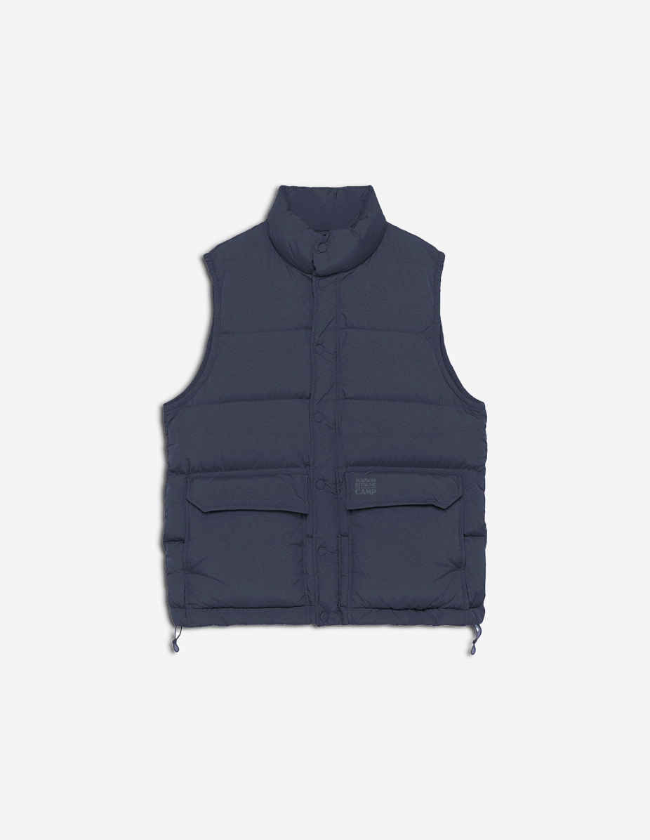 DETAILS Sleeveless lightweight nylon puffer jacket. Comfort fit and Maison Kitsune Camp signature. - Lightweight quilted sleeveless vest in nylon - Comfort fit - Down padding - Hidden zip fastening under snap placket - Two front patch pockets with flaps - Maison Kitsune Camp signature printed on the front pocket and back PM02231WQ4070-P480 SIZE & CUT Cut: COMFORT Sizing: MEN The male model is 6.1 and is wearing size M MATERIAL Main Material: 100% POLYAMIDE, Stuffing material: 90% DUCK DOWN, 10% DUCK FEATHER, Lining: 100% POLYAMIDE TRACEABILITY Made in China