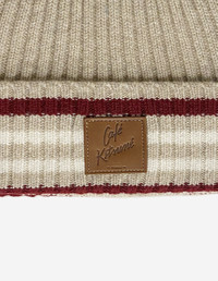 DETAILS Striped cuff virgin wool beanie with embossed leather Cafe Kitsune patch. - Virgin wool beanie with striped cuff - Cafe Kitsune embossed leather patch on the cuff PU06102KT1179-0390 SIZE & CUT Sizing: UNISEX MATERIAL 100% WOOL TRACEABILITY Made in China