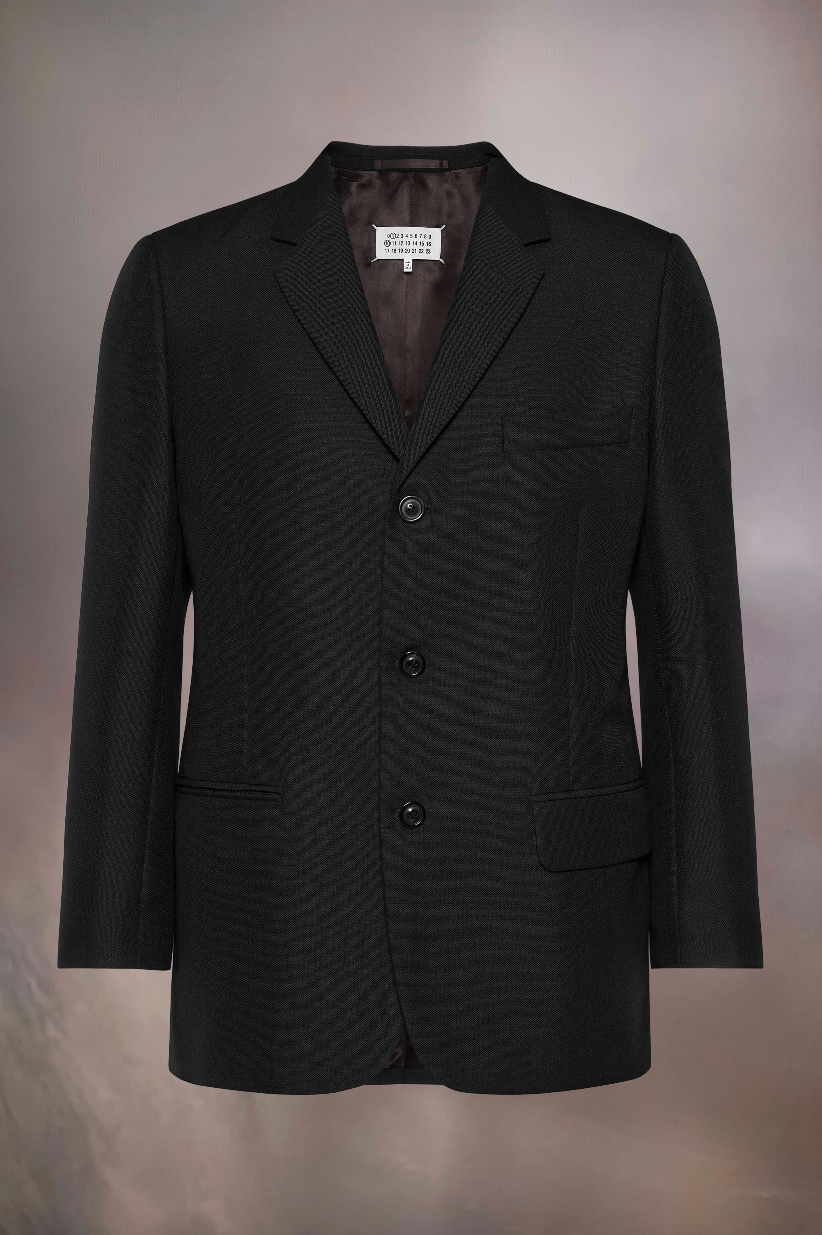 Crafted from British mohair, the blazer is single-breasted with three buttons. A back vent offers movement, while the front has a notched collar and flap pockets. The Maison's Work-in-progress stitches are seen at the cuffs for an unfinished aesthetic that offsets the classic tailoring. Maison Margiela's signature, the Four stitches, appear at the back; the opposite of a label. Product Details Item ID S50BN0528S49892900 Composition: 70% wool, 30% mohair Lining: 65% acetate, 35% viscose-rayon British mohair suit jacket Notch lapel Single-breasted horn button closure Welt chest pocket Flap pockets Basting stitches on cuffs Single vent Four stitches at the back Made in Italy Model is 6'2" tall and wears a size 46.