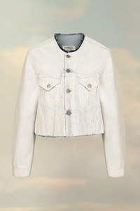 This fitted collarless denim jacket is cropped at the waist and has a cracked white effect. It features classic metal hardware and seam detailing. The contrast neck has a raw finish and the back shows the four white stitches, showing the hand of the Maison: the opposite of a label. Product Details Item ID SI1AM0009S30561967 Composition: 100% Cotton Cropped jacket Handpainted coating Décortiqué lasered details Collarless Button closure Two button closure flap pockets Button closure cuffs Four stitches at the back Made in Italy The model is 5'10" tall and wears size 46.