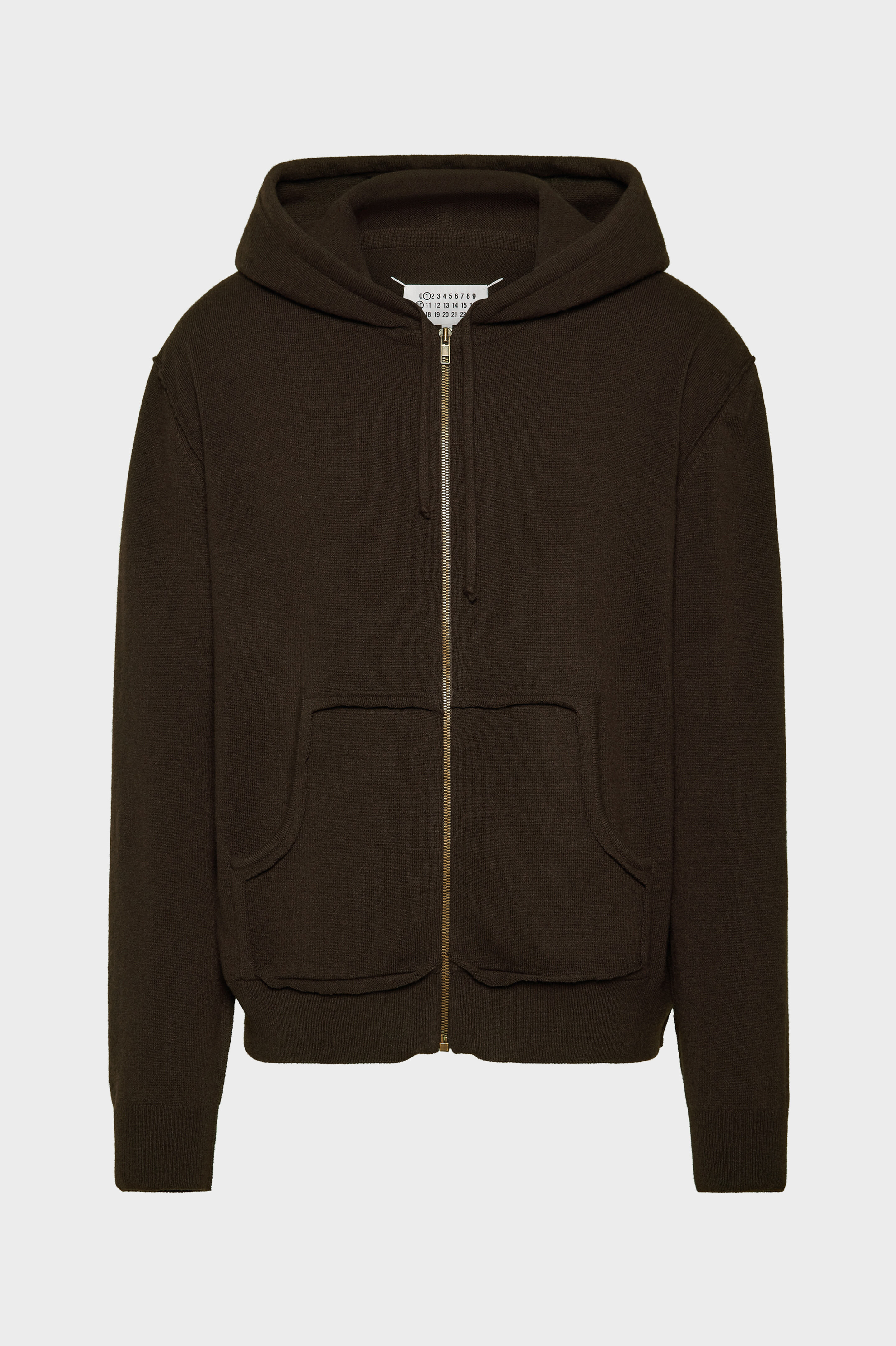 Crafted from a soft cashmere wool bend, the loungewear zip-through hoodie features a Decortique front pocket, adding texture and volume to the front of the sweater. It is designed with dropped shoulder seams for a relaxed take, ribbed trims and a drawstring at the neck. Maison Margiela's signature, the four stitches, appear at the back; the opposite of a label. Product Details Item ID S50GU0234M13095144M Primary Fabric: 70% Wool 30% Cashmere Midweight wool cashmere blend crewneck Gauge 12 Zip closure Adjustable drawstring hood Decortique kangaroo pocket with visible seams Ribbed trims Four stitches at the back Model is 185 cm tall and wears a size S.