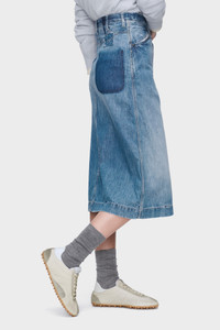 This denim midi skirt is crafted with a classic five-pocket construction and subtle distressed accents. At the back, the Memory of the jacron label is evoked through contrast stitching. At the back, the Maison’s signature four stitches appear; the opposite of a label. Product Details Item ID S51ME0058M30021963 Primary fabric: 100% cotton Pocket lining: 65% polyester 35% cotton 8,05 oz japanese denim Midi length Exposed stitching at pockets Front button and zip closure Four stitches at the back Made in Italy
