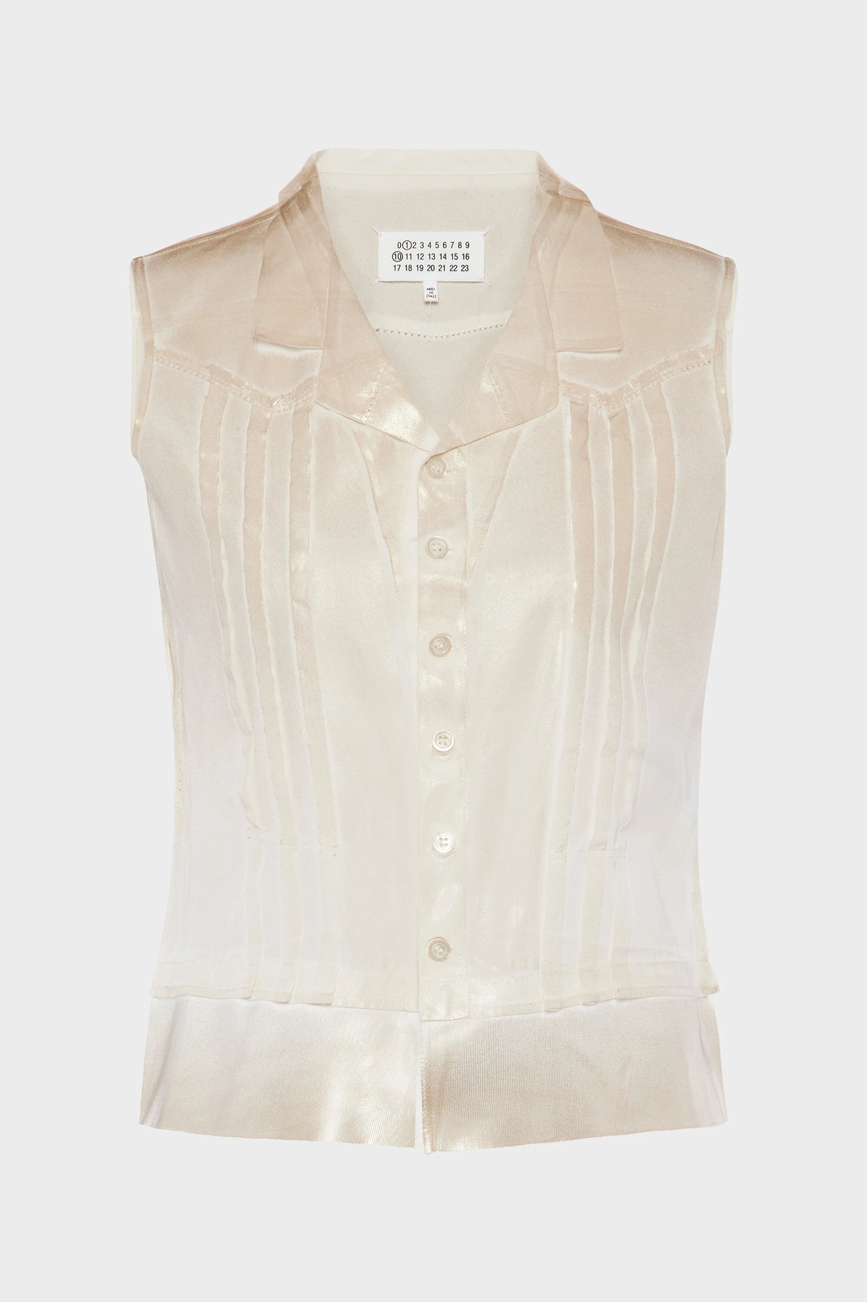 This sleeveless shirt is crafted in cotton with the Maison’s pressed and foiled technique, transforming the fabric through heat and pressure to create a lustrous, tactile finish. Vertical pleats and a pointed collar lend structure to the fluid form, while the reflective surface redefines its texture and light. At the back, the Maison’s signature four stitches appear; the opposite of a label. Product Details Item ID S51NC0633M35112102 Primary fabric: 100% viscose-rayon Lining: 100% viscose-rayon Viscose taffetas Sleeveless Notched collar neckline Front button closure Four stitches at the back Made in Italy