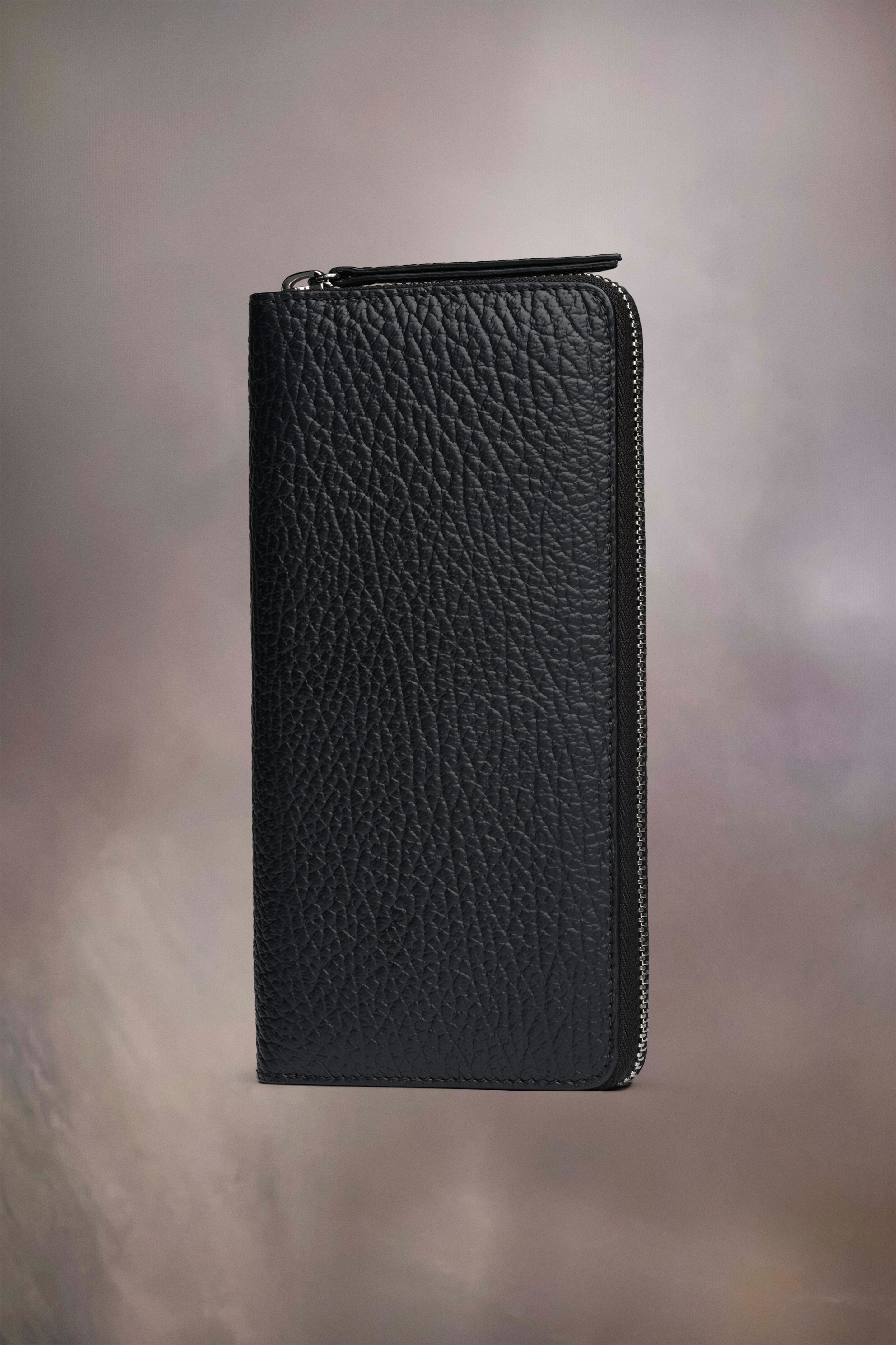 Crafted from embossed grainy leather, the zip-around wallet has an inner zipped coin purse and card holders, with inner numeric logo. Maison Margiela's signature, the four stitches, appear at the back; the opposite of a label. Product Details Item ID S56UI0110P4455T8013 Outer: Grainy calf leather with soft touch Inside: Calf leather Lining: Viscose Four stitchesat the back Zip closure with leather strap Inside logo stamping Inside zip closure pocket Inside flat pockets Four card slots Clean with a specific leather cleaner product and a humid microfiber cloth Made in Italy 19 cm x 10 cm/7,5 in x 4 in (Length x Height)