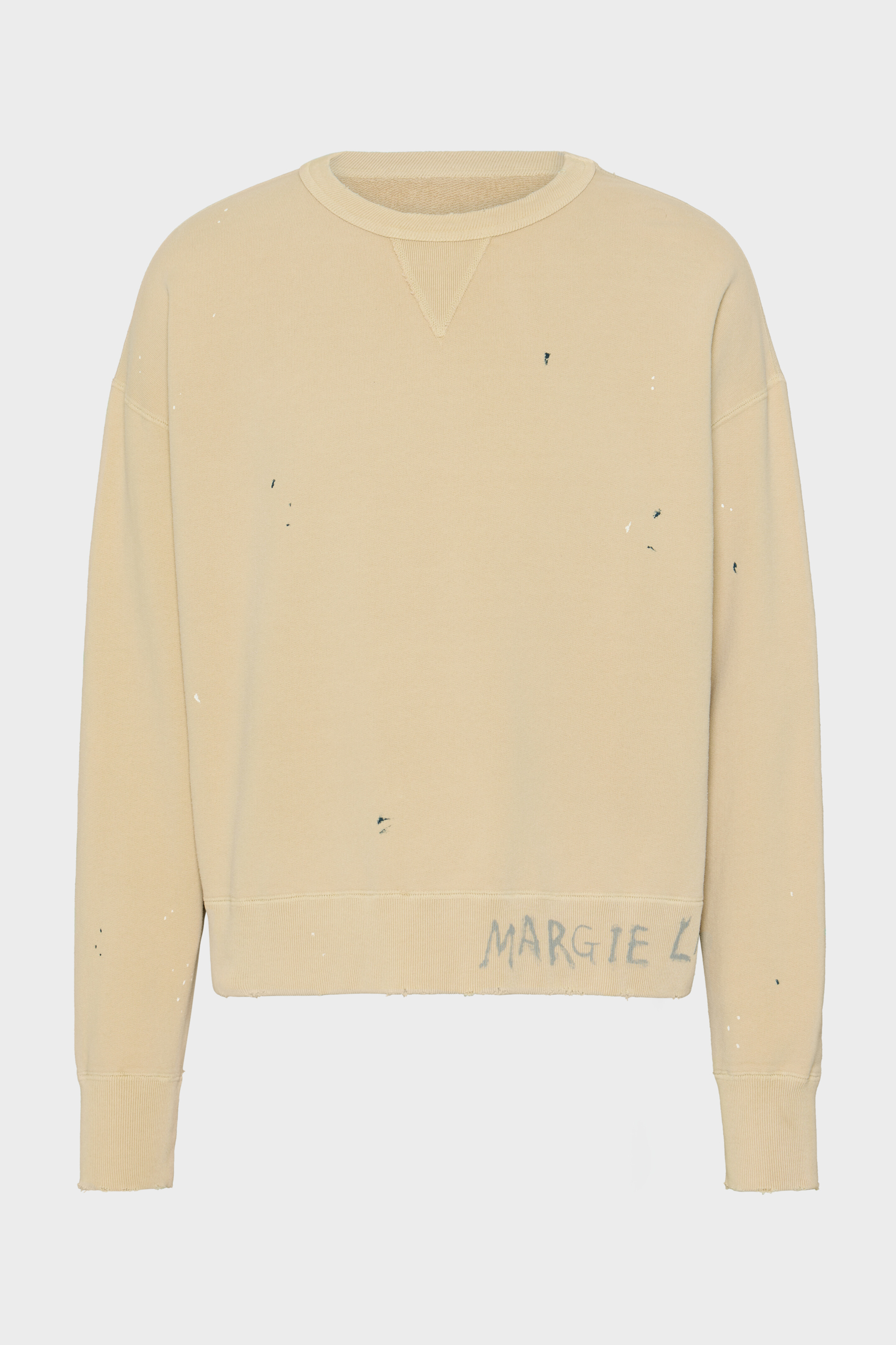 This cotton jersey sweatshirts is adorned with Margiela graffiti logo at the hem, along with fraying edges, as part of a "worn-out" aesthetic. It presents a dirty treatment with the design following a dropped shoulder silhouette for a relaxed take. Maison Margiela's signature, the four stitches, appear at the back; the opposite of a label. Product Details Item ID S50GU0237M25019112 Primary Fabric: 100% Cotton Cotton fleece sweatshirt Crewneck Dropped shoulder Maison Margiela handwritten logo at the front Ribbed trims Four stitches at the back Made in Italy