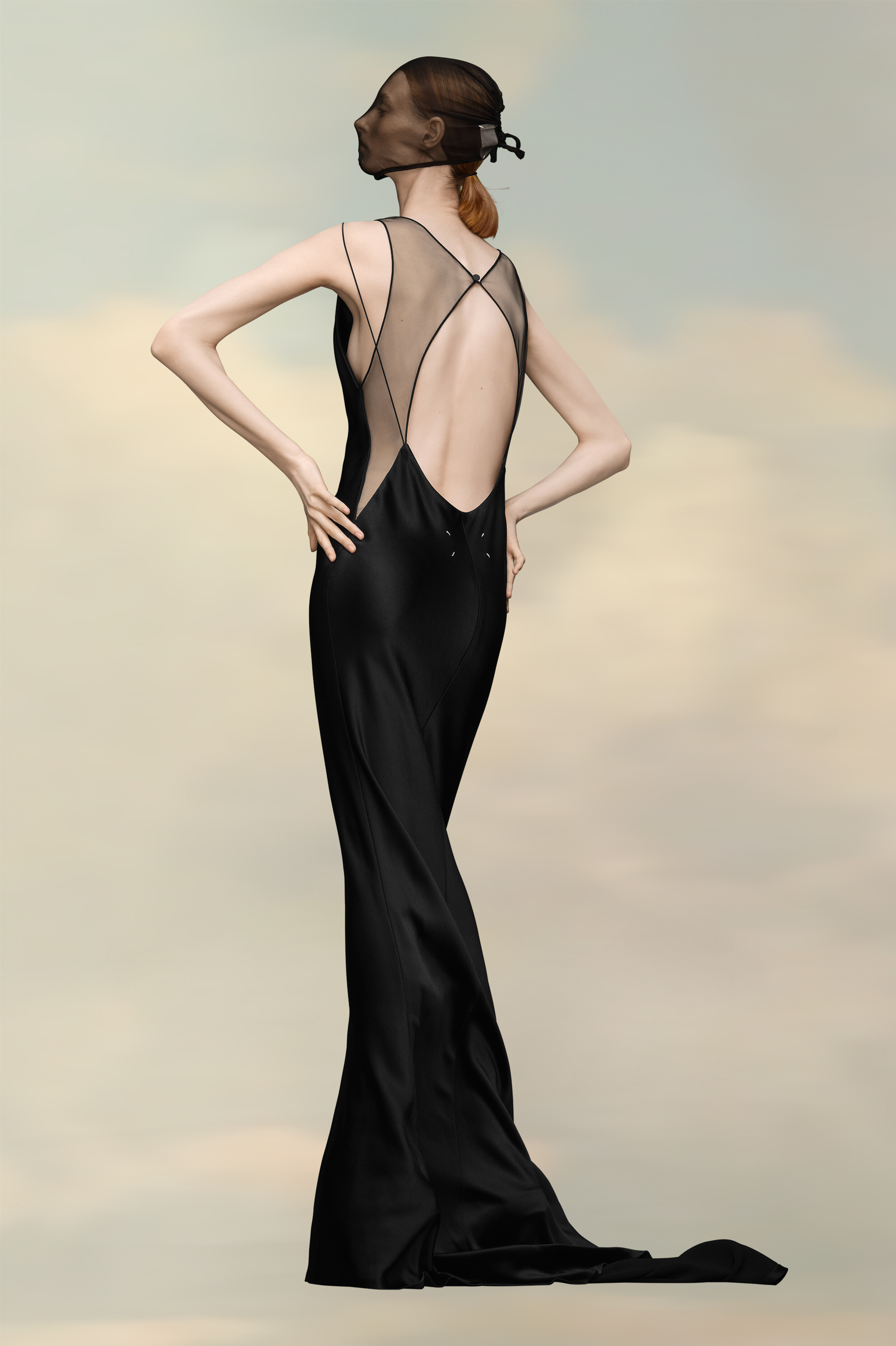 In hammered satin, this maxi dress which pools on the floor, follows a sleeveless design with a boat neck. Sheer panelling features at the chest and around the back, with a large cut-out. It's finished with four white stitches showing the hand of the Maison: the opposite of a label. Product Details Item ID SI0CT0001S49465900 Composition: 52% Viscose, 48% Acetate Hammered satin evening dress with transparent organza details Round neck Sleeveless Flared silhouette with train Bare back opening with button closure Four stitches at the back Made in Italy
