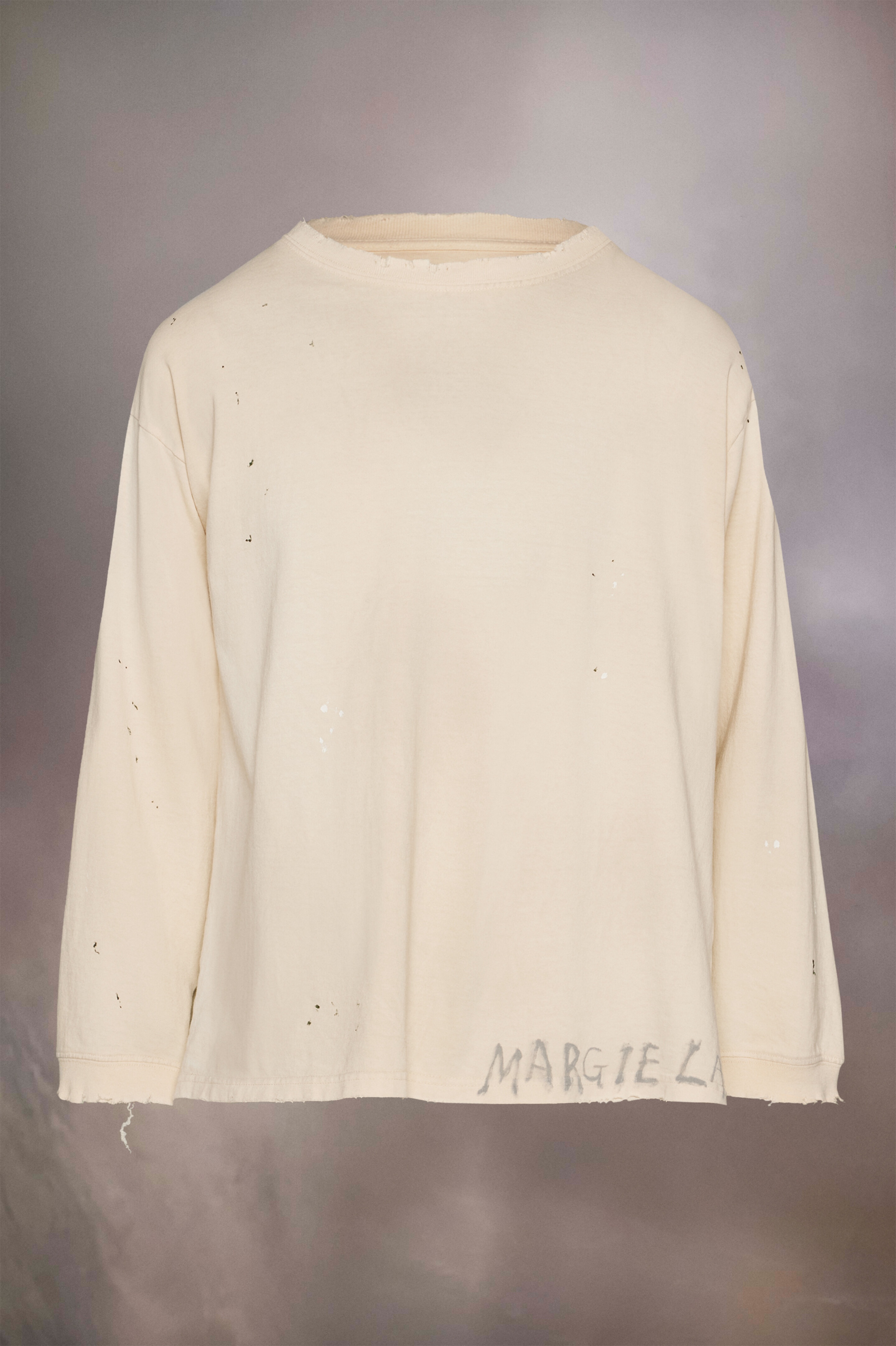 In cotton jersey, the round-neck, long-sleeve top features a handwritten Margiela logo at the hem. Raw edges present an undone aesthetic. Maison Margiela’s signature, the Four stitches, appear at the back; the opposite of a label. Product Details Item ID S50GC0696S24567102 Primary fabric: 100% cotton Secondary fabric: 100% cotton Cotton jersey T-shirt Crew neck Maison Margiela handwriting print at the front Destroyed details Dirty effect Ribbed trims Four stitches at the back Made in Italy Model is 187cm tall and wears a size S.