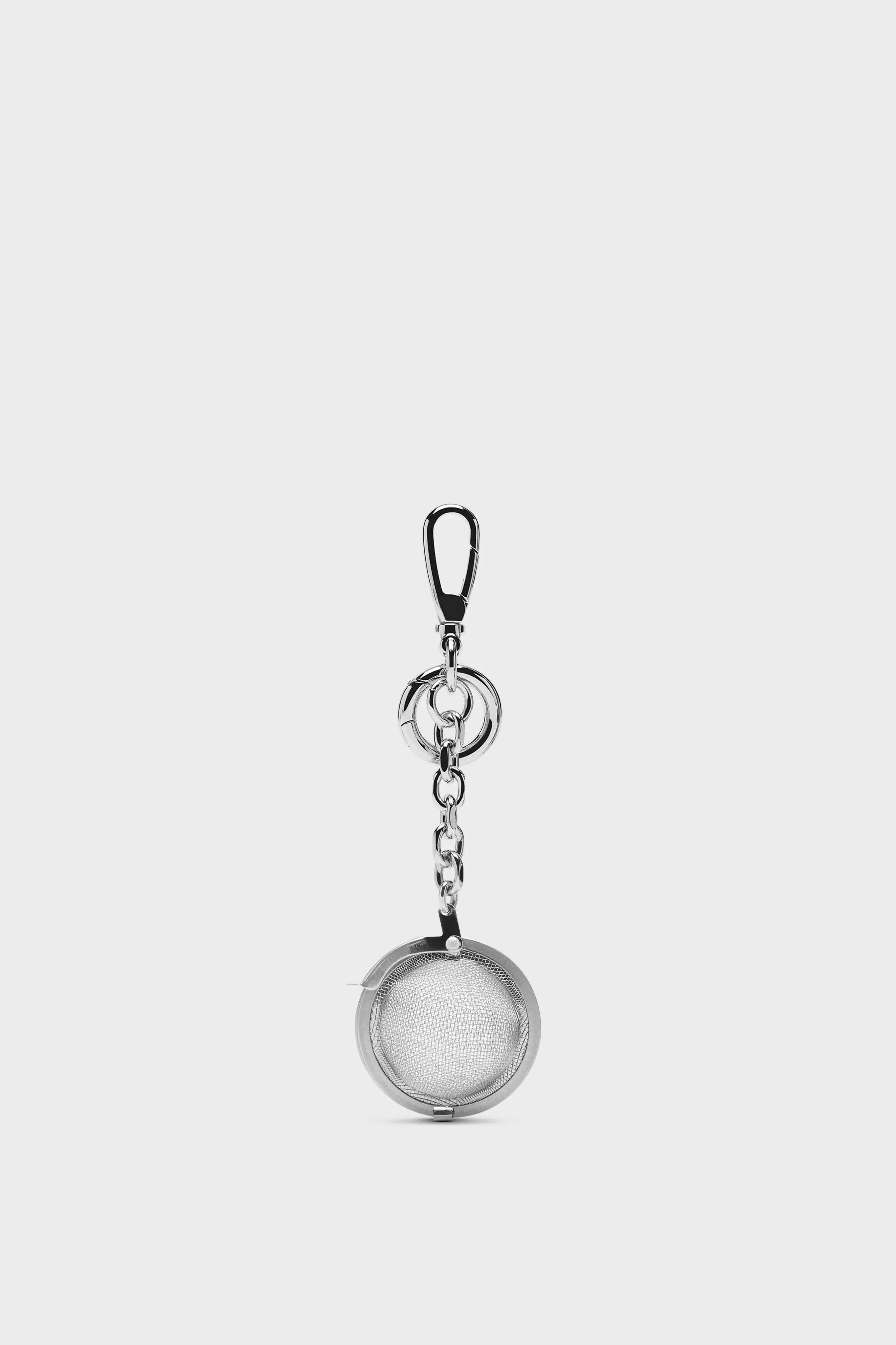 The Tea Infuser Charm transforms a functional object into a playful accessory. Crafted in polished metal, it opens to reveal a perforated interior, recalling a traditional tea strainer. Suspended from a detachable chain, it transitions from pocket piece to bag charm. At the front, the engraved logo asserts the Maison’s identity. Product Details Item ID SA1UA0013P8834H7161 Composition: 100% steel, 100% brass, 100% zama Functional mesh sphere with hinged closure Polished chain with snap hook and ring Key ring accessory Made in Italy