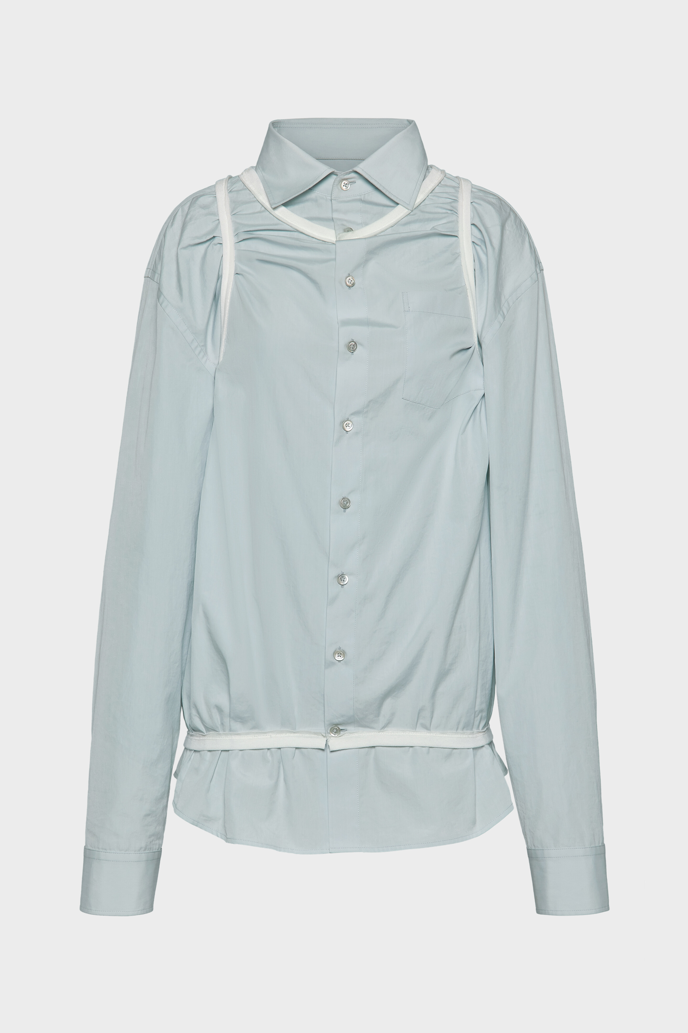 The shirt is crafted from cotton, featuring a classic smart collar, central buttons and a single chest pocket. The cuffs are buttoned and it is designed with a curved hem. To update the silhouette, piping appears in a Decortique tank top shape around the shoulders and by the hem, creating a ruching effect. Maison Margiela's signature, the four stitches, appear at the back; the opposite of a label. Product Details Item ID S51DT0019M35397500 Primary Fabric: 100% Cotton Cotton shirt Pointed collar Mother of pearl button closure Buttoned cuffs Curved hem Decortique details Four stitches at the back Made in Italy Model is 178 cm tall and wears a size 40.
