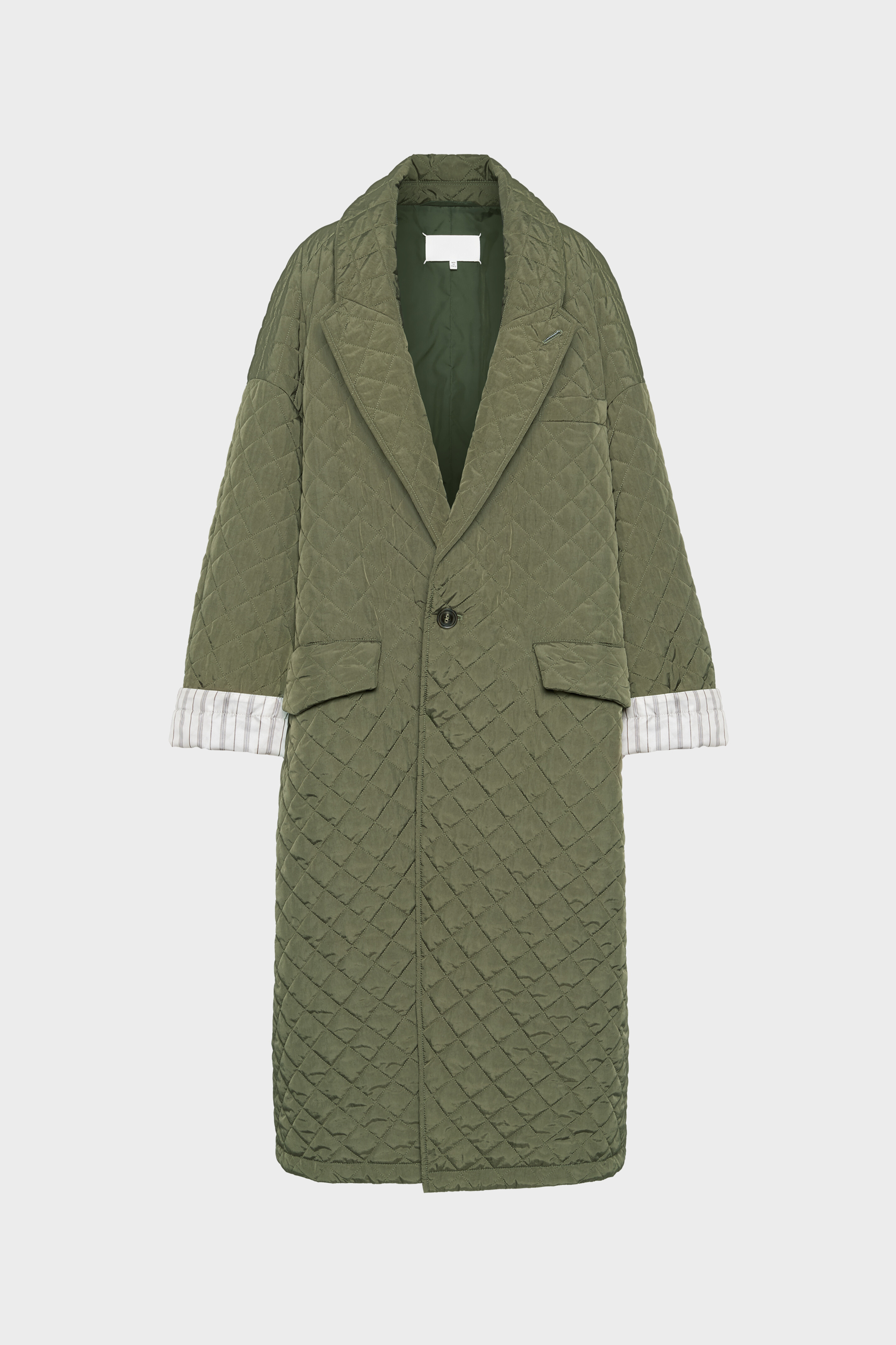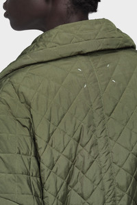 A longline quilted coat with a relaxed silhouette and a sculpted stand collar that can be worn up or down. The contrast pinstripe lining is subtly revealed at the rolled-up sleeves. Finished with a button closure, flap pockets and a single welt chest pocket, the design merges utility with understated elegance. The quilting technique subtly elevates texture and structure, layering fine materials to create a delicate, three-dimensional effect. The back features the Maison’s signature, the four stitches; the opposite of a label. Product Details Item ID S29AA0312M35666710 Primary fabric: 100% Polyamide-Nylon Wadding: 95% Polyester, 5% Polyamide-Nylon Sleeve Lining: 55% Viscose-Rayon, 45% Cupro Lining: 100% Polyamide-Nylon Long quilted coat Diamond-pattern topstitching throughout Sculptural stand collar Chest welt pocket and two flap pockets Dropped shoulders and wide sleeves Button front closure Four stitches at the back Made in Italy