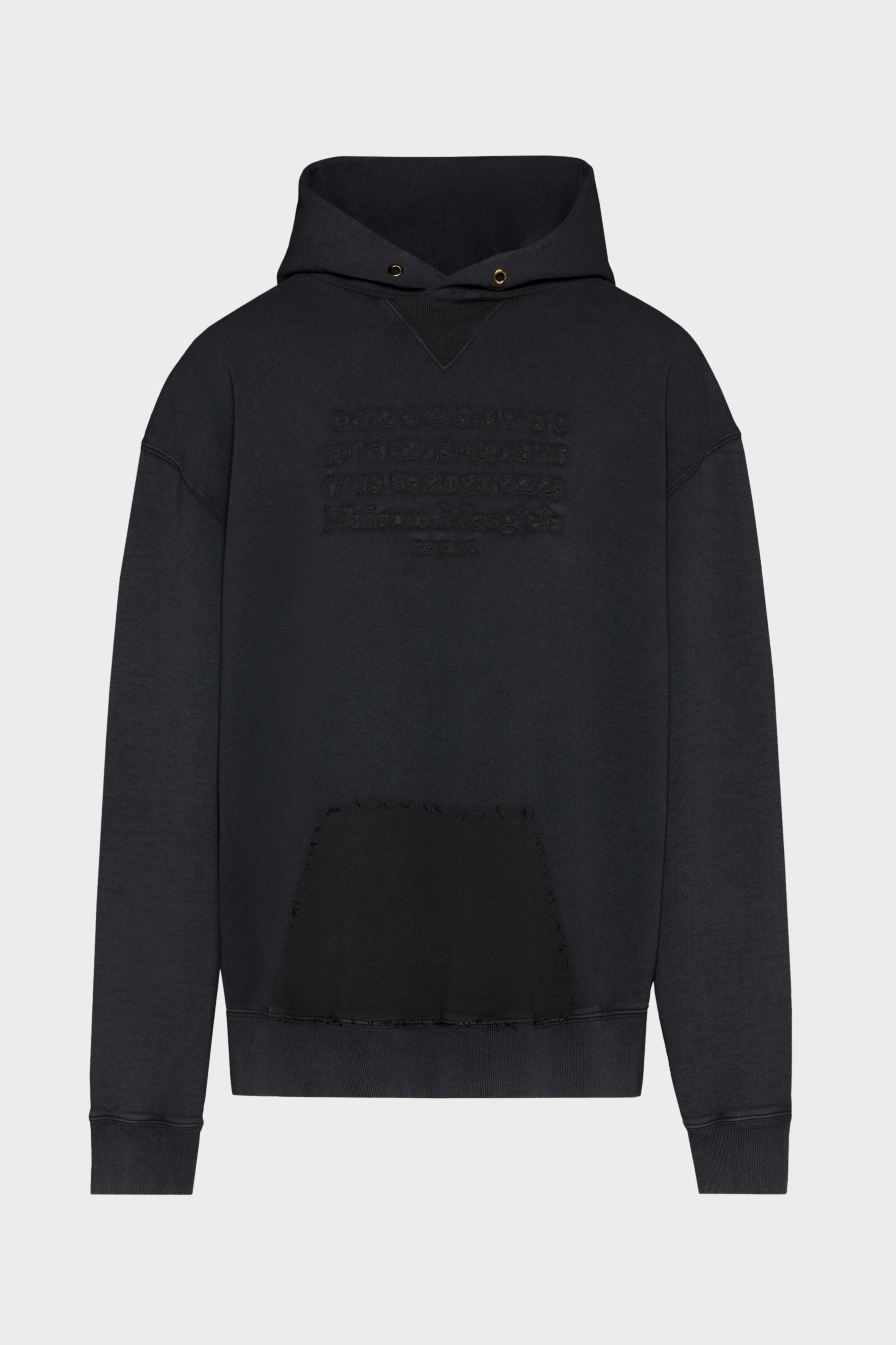 The organic cotton fleece hoodie features the new reverse logo, with reverse applicated stitch to give the impression it has been sewn and then unstitched. It comes with a missing drawstring for a minimal take and the Memory of kangaroo pocket. Maison Margiela’s signature, the Four stitches, appear at the back; the opposite of a label. Product Details Item ID S50GU0216S25570860 Primary fabric: 100% cotton Secondary fabric: 100% cotton Organic cotton fleece hooded sweatshirt Vintage effect Maison Margiela numbers logo embroidery at the front Decortique kangaroo pocket Destroyed details Ribbed trims Four stitches at the back Made in Italy Model is 187cm tall and wears a size S.