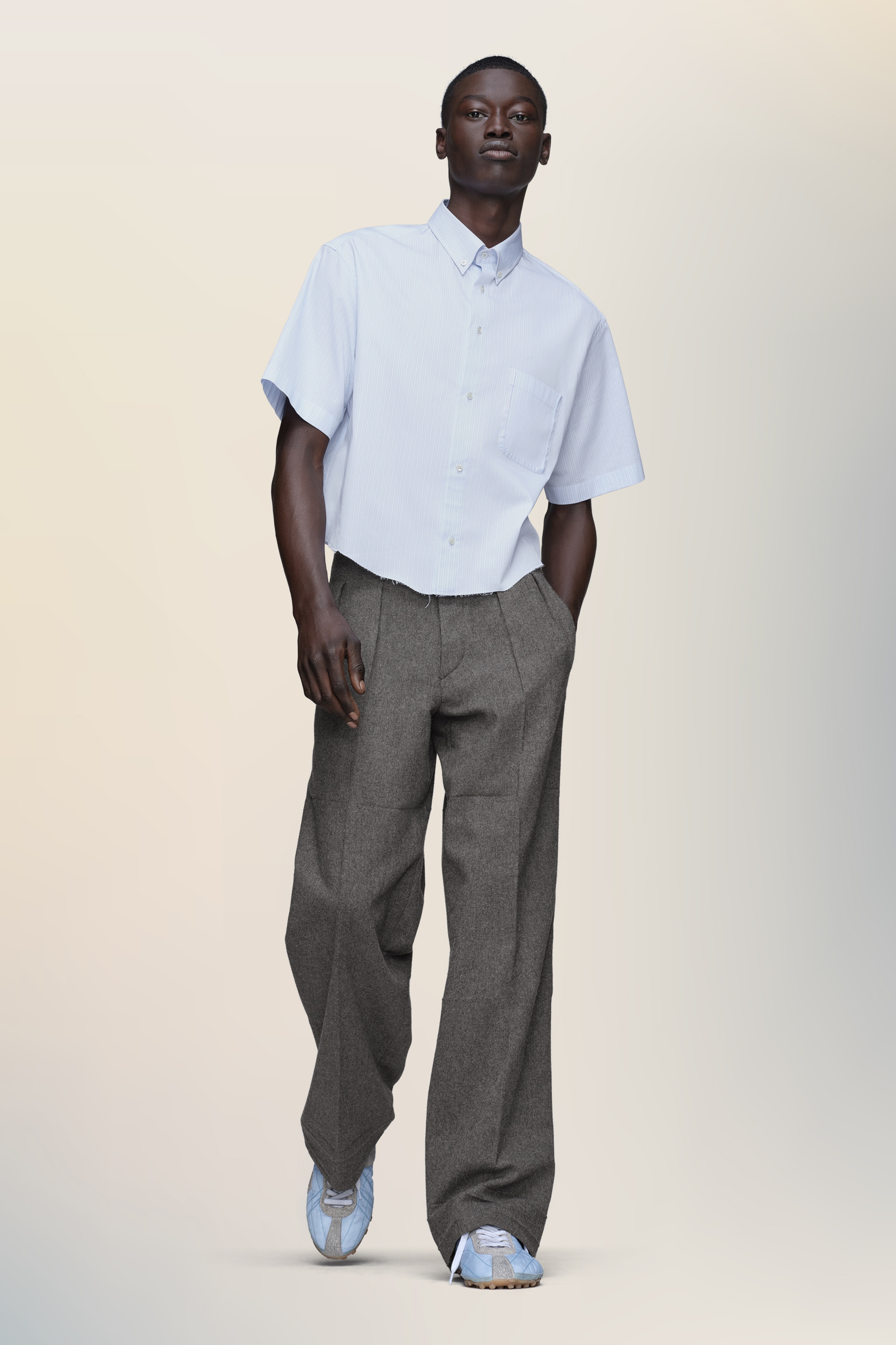 This short-sleeved shirt is cropped in length and designed with a classic collar and a reverse Decortique chest pocket. The raw hem introduces a subtle note of deconstruction, offering a quietly undone take on everyday shirting. Maison Margiela’s signature, the four stitches, appear at the back; the opposite of a label. Product Details Item ID S50DR0012M35529471F Primary fabric: 100% cotton Short-sleeved shirt in cotton with button-down collar Chest patch pocket and button front closure Raw-cut hem Four stitches at the back Made in Italy