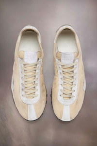 Crafted from drill, hairy suede and calfskin with a vintage treatment, the Sprinters silhouette is inspired by retro running shoes. Block colour contrast is met with the classic tongue displaying the numeric logo. The studded base also features number detailing with the 22 encircled indicating the Maison's footwear collection. Maison Margiela's signature stitch appears at the back; the opposite of a label. Product Details Item ID S57WS0509P8190HA775 Upper: 54% Polyester 46% Cotton Contrast: 100% Calf Leather Contrast: 100% Calf Leather Lining: 100% Polyester Contrast: 100% Calf Leather Inside: 100% Calf Leather Sole: 100% Rubber Low-top sneakers in drill cotton with vintage treatment Stripe down the center of the toe area Cleated rubber sole with numerical logo details Logo label on the tab White stitching at the back Clean with a gentle leather cleanser Made in Italy