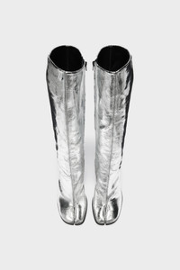 With a broken mirror finish, these heeled knee-high boots feature the Tabi split-toe, inspired by the traditional 15th century Japanese sock bearing the same name – launched for the Maison's debut collection in 1989. It captures the avant-garde and insubordinate spirit of the Maison and exists as a heritage classic, continually explored through each collection. Product Details Item ID S34WW0057P5016T9002 Upper: 100% calf leather Lining: 100% lamb leather Inside: 100% lamb leather Sole: 100% calf leather Contrast: 100% rubber Heel height: 8 cm/3 in Cylindrical heel Knee height boots with broken mirror effect Tabi split toe White stitching at the back Covered zip closure Made in Italy A digital certificate provided by the Aura Blockchain Consortium guarantees the authenticity of this product. Discover more on auraluxuryblockchain.com/#about