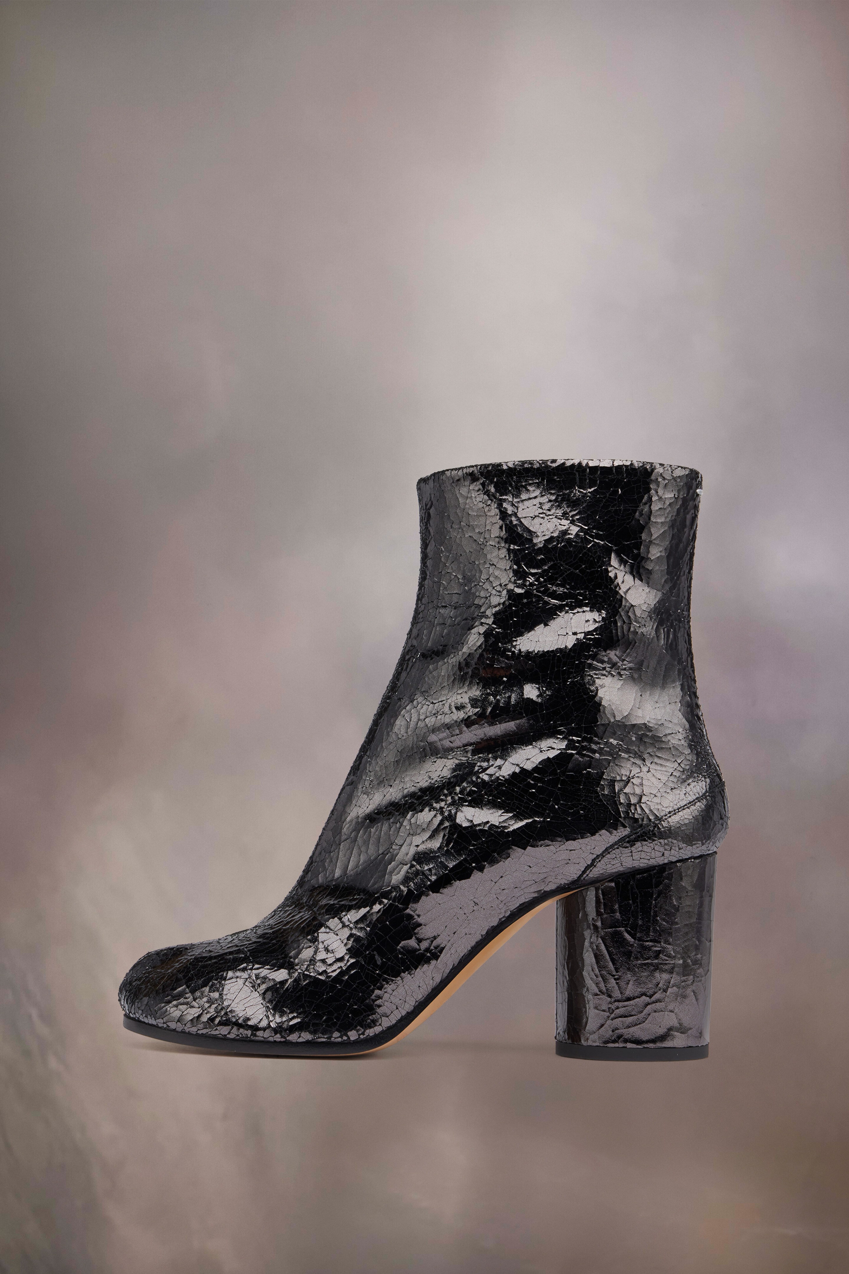 The Tabi boots in the broken mirror finish feature the Maison's iconic Tabi split-toe shape. They have a cylindrical high heel. Tabi styles are inspired by the traditional 15th century Japanese sock bearing the same name. It captures the avant-garde and insubordinate spirit of the Maison and exists as a heritage classic, continually explored through each collection. Product Details Item ID S58WU0260P5016T8001 Upper: 100% calf leather Lining: 100% calf leather Inside: 100% calf leather Sole: 100% calf leather Contrast: 100% rubber Heel height: 8 cm/3 in Cylindrical heel Ankle boots with broken mirror effect Tabi split toe White stitching at the back Hook closure Made in Italy A digital certificate provided by the Aura Blockchain Consortium guarantees the authenticity of this product. Discover more on auraluxuryblockchain.com/#about