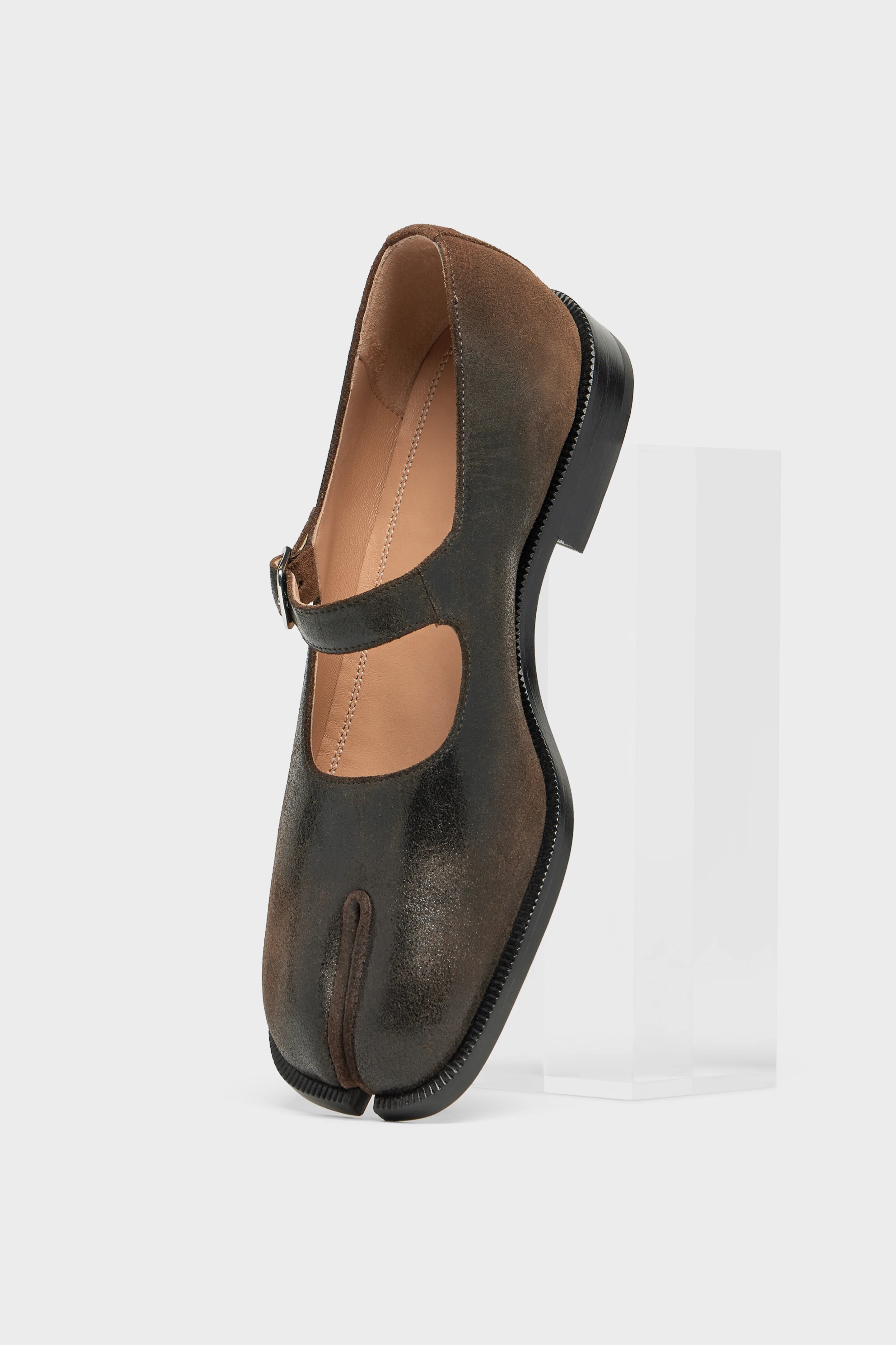 Product Details Item ID S39WL0119P7549H8322 Upper: 100% calf leather Lining: 100% ovine leather Inside: 100% ovine leather Sole: 100% calf leather Contrast: 100% rubber Heel height: 1.9 cm Suede with foil treatment Tabi split toe Buckle closure strap Four stitches at the back Made in Italy