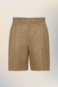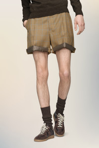 Pleated shorts in a textured suiting fabric, with a clean silhouette and subtle structure. A striped lining is revealed at the waistband – an understated detail that reflects the Maison’s Anonymity of the Lining concept. Maison Margiela’s signature, the four stitches, appear at the back; the opposite of a label. Product Details Item ID S50MU0090M35648001F Primary Fabric: 100% Wool Pocket Lining: 100% Cotton Lining: 92% Cotton 8% Polyester Half Lining: 100% Viscose-Rayon Tailored shorts with exposed interior waistband Front pleats Asymmetrical belt loops Four stitches at the back Made in Italy