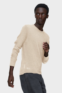 A fine wool blend sweater that reveals a subtle play of tones across its surface. The piece is finished with a single patch of visible mending at the hem, introducing a quietly subversive detail to its otherwise classic form. At the back, the Maison’s signature four stitches appear; the opposite of a label. Product Details Item ID S50HL0057M13235106F Primary fabric: 80% wool 20% polyamide-nylon Gauge 14 lightweight knitted Long sleeves Round neck Four stitches at the back Made in Italy
