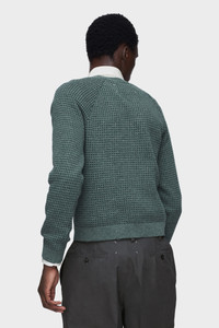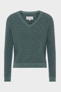 A V-neck sweater crafted from a wool blend, distinguished by an intricate jacquard pattern. Ribbed cuffs and hem provide structure, grounding the knit in classic detailing while the texture subverts its simplicity. At the back, the Maison’s signature four stitches appear; the opposite of a label. Product Details Item ID S50HN0020M13233609J Primary fabric: 94% wool 6% polyamide-nylon Gauge 14 midweight jacquard Long sleeves V-neck Four stitches at the back Made in Italy