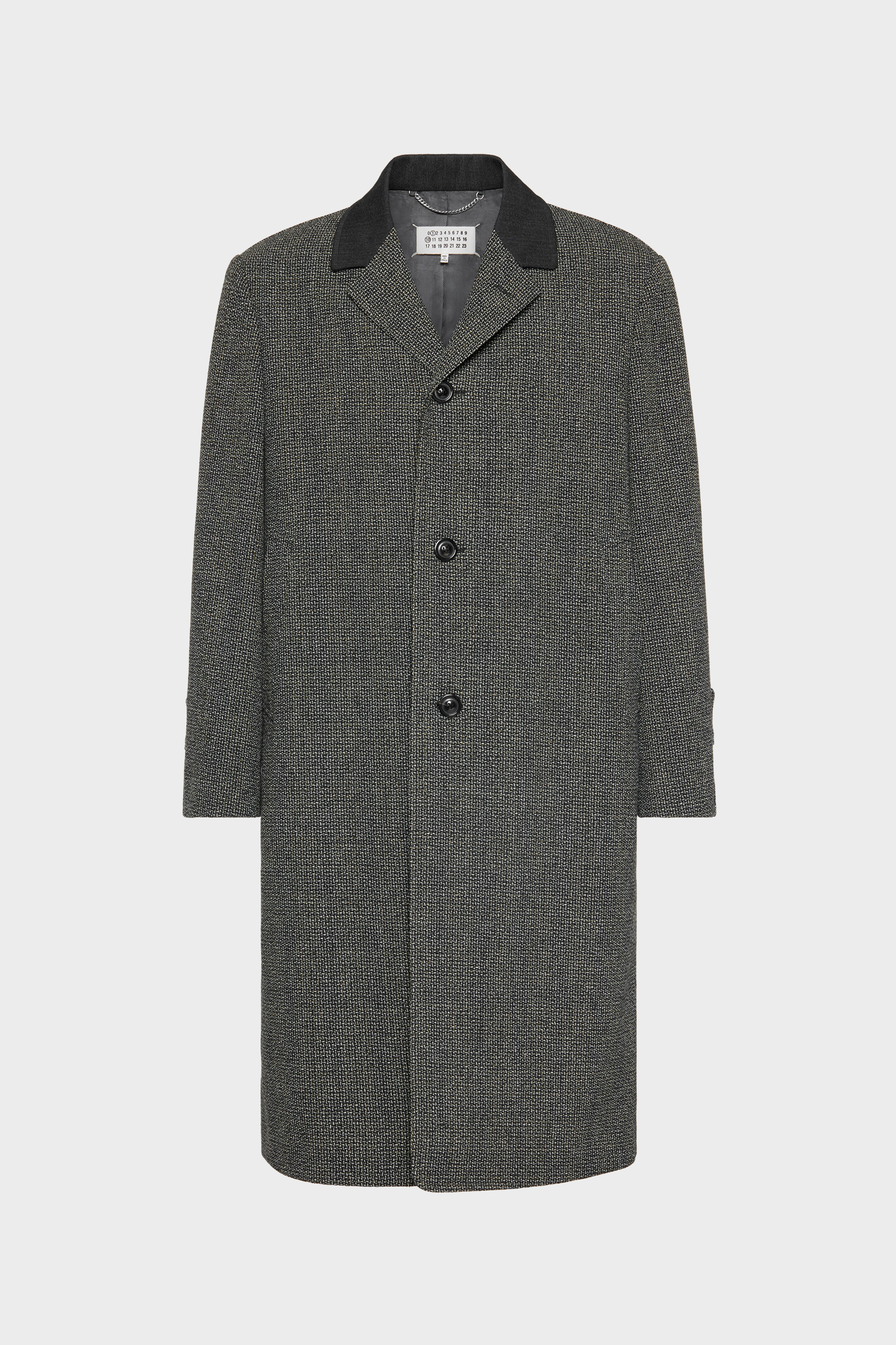 This wool-blend single-breasted coat reflects the collection’s refined approach to tailoring. It balances structured shoulders, a notched lapel and four front buttons, creating a composed, disciplined silhouette. Maison Margiela’s signature, the four stitches, appear at the back; the opposite of a label. Product Details Item ID S50AA0159M35485001F Primary fabric: 93% virgin wool 7% polyamide-nylon Secondary fabric: 100% virgin wool Lining: 100% viscose-rayon Pocket lining: 100% cotton Single-breasted coat in virgin wool blend with a contrast collar Three-button front closure Notched lapels Four stitches at the back Made in Italy