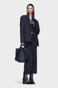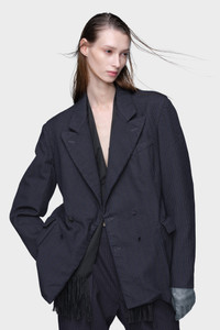This jacket is crafted in wool woven with a fine pinstripe. Cut with a relaxed silhouette, it features softly padded shoulders, notch lapels and flap pockets at the waist. An integrated internal scarf, lifted from a vintage design, adds subtle function to the piece. The exposed buttonholes reveal the memory of a fastening – a quiet expression of the Maison’s deconstructive approach to tailoring. Maison Margiela’s signature, the four stitches, appear at the back; the opposite of a label. Product Details Item ID S29BN0411M35558511F Primary Fabric: 96% Wool, 4% Polyester Lining: 55% Cotton 45% Cupro Pocket Lining: 100% Cotton Sleeve Lining: 100% Cotton Jacket in pinstriped woven wool Notch lapels and flap waist pockets Irregular hem detail Light shoulder padding Four stitches at the back Made in Italy