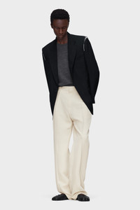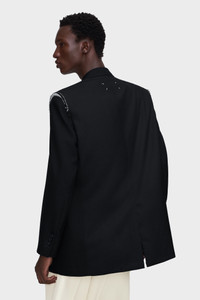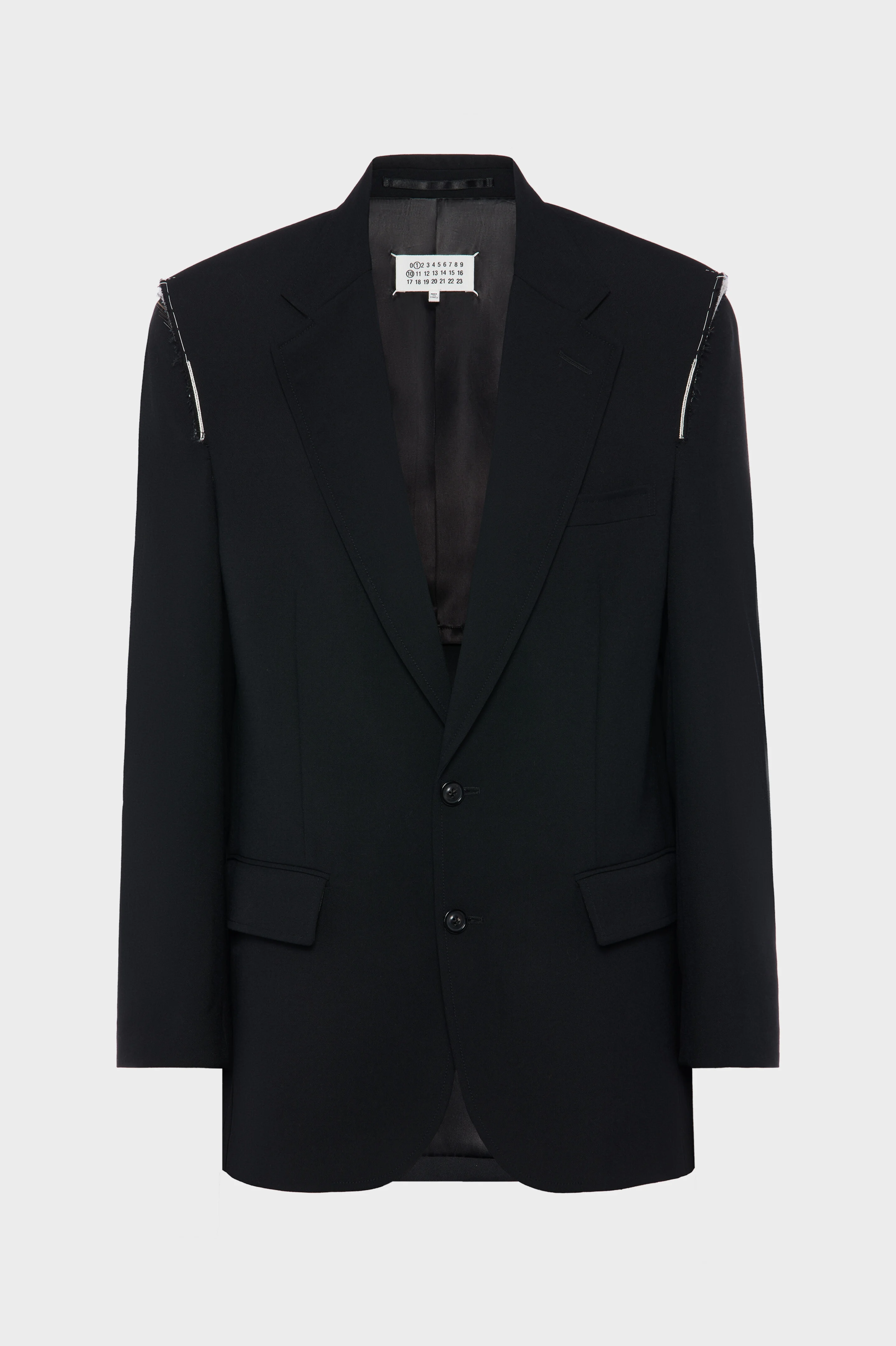 This single-breasted jacket in virgin wool reinterprets formal tailoring through the Maison's anonymity of the lining concept. Its structured silhouette is interrupted at the shoulders, where raw elements reveal the garment’s inner architecture. A subversive reworking of sartorial codes, it closes with a single button fastening. At the back, the Maison’s signature four stitches appear; the opposite of a label. Product Details Item ID S50BN0549M35745900 Primary fabric: 100% virgin wool Gauge: tropical wool Lining: 63% acetate 37% viscose-rayon Pocket lining: 100% cotton Raw edge effect on shoulder seams Long sleeves Shirt collar Front button closure Four stitches at the back Made in Italy