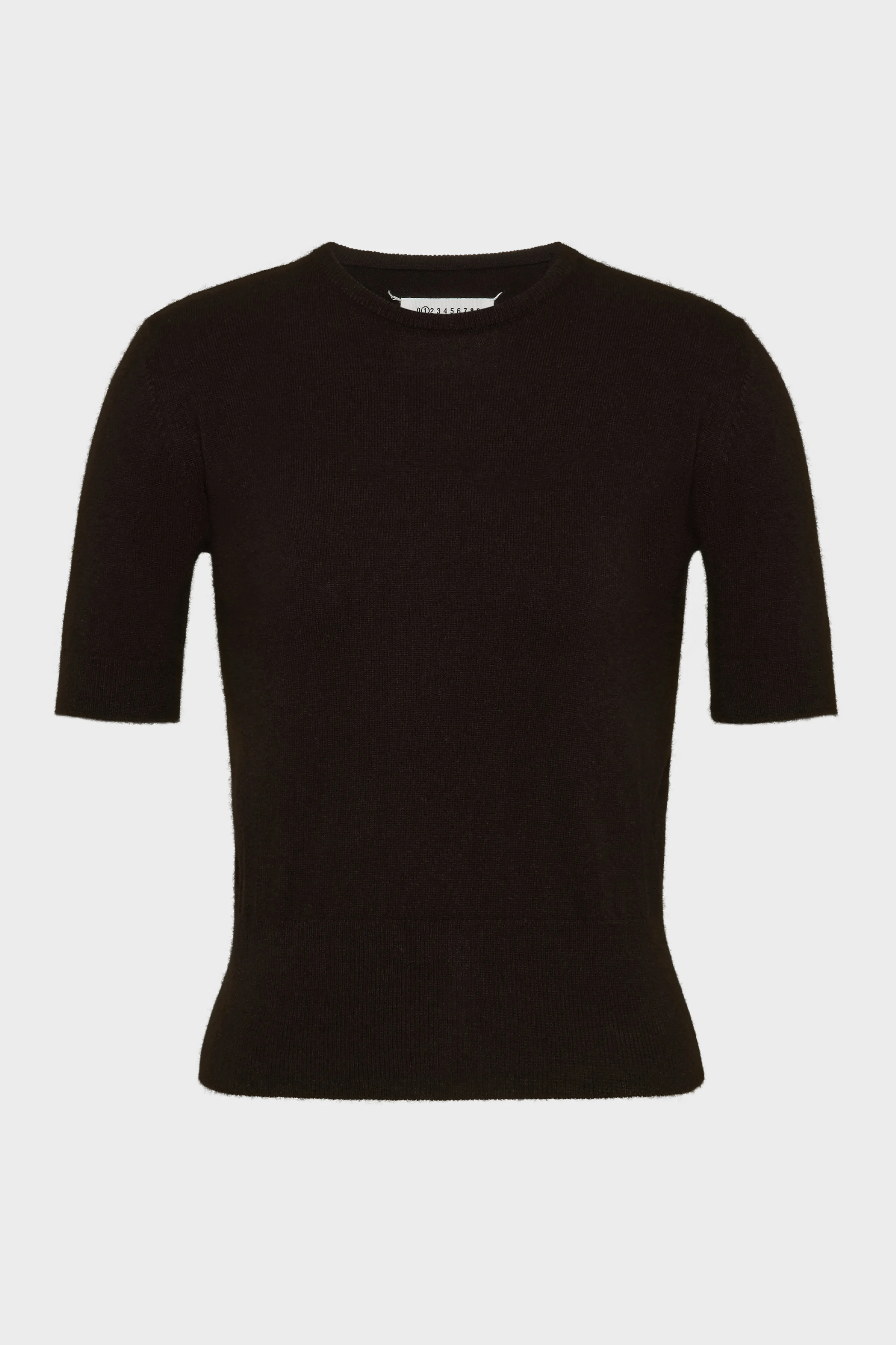 In virgin wool, the minimal knitwear top has a classic crew-neck design and offers a relaxed fit with cropped length. It features short sleeves with ribbed trims around the neck, cuffs and at the hem for further texture. Maison Margiela's signature, the four stitches, appear at the back; the opposite of a label. Product Details Item ID S51HL0018M13090144M Primary Fabric: 100% Virgin Wool Gauge 12 Virgin wool top Crewneck Ribbed trims Four stitches at the back Made in Italy Model is 178 cm tall and wears a size S.