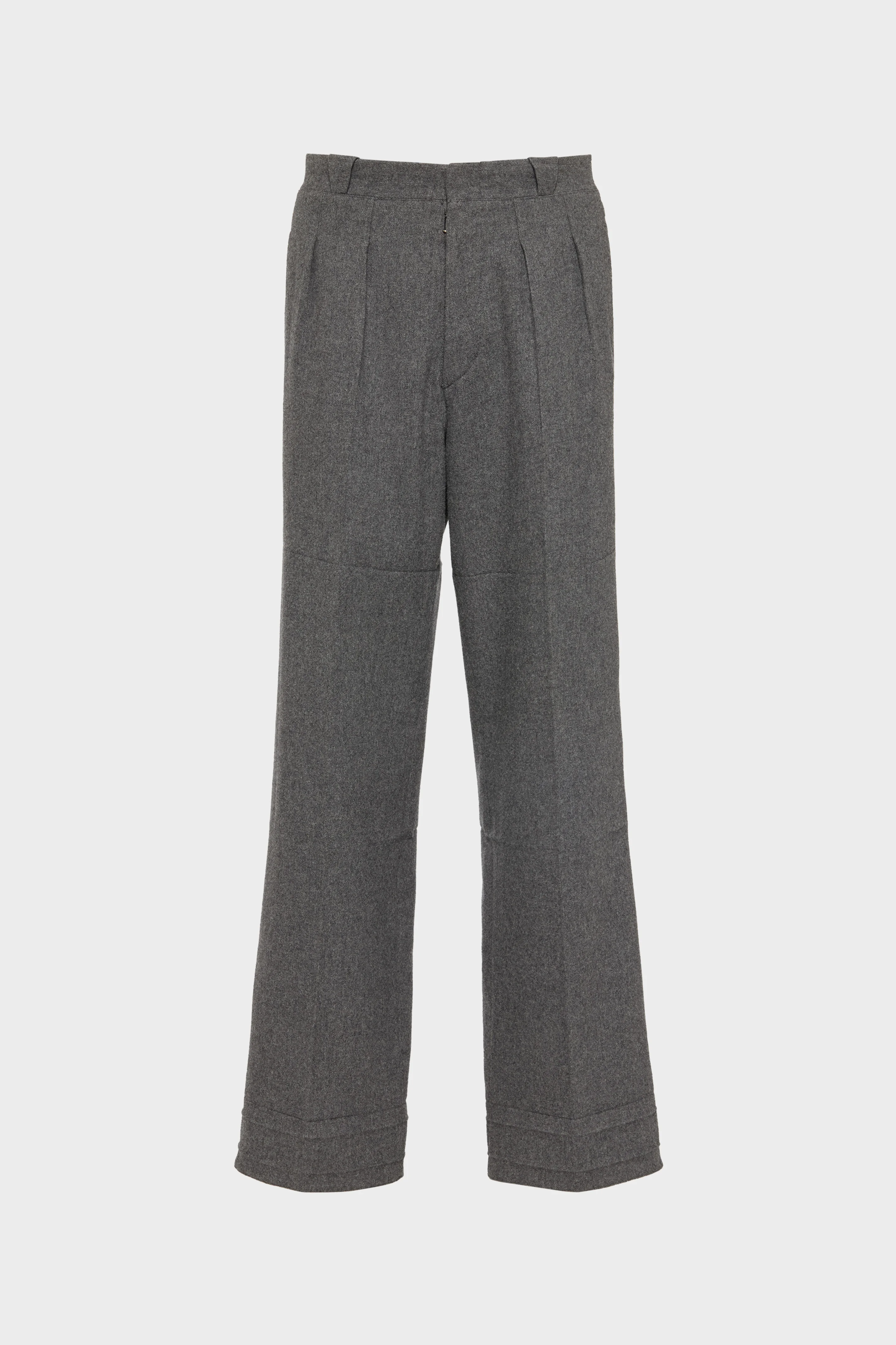 These tailored trousers feature soft pleats, subtle seam detailing and are finished with the memory of the hem technique. The clean lines and slightly flared leg reflect the Maison’s elevated interpretation of equestrian dress codes. Maison Margiela’s signature, the four stitches, appear at the back; the opposite of a label. Product Details Item ID S50KA0686M35562854M Primary Fabric: 60% Wool 30% Polyester 10% Polyamide-Nylon Half Lining: 100% Viscose-Rayon – Pocket Lining: 100% Cotton Straight-leg trousers in structured wool blend Pleated front with belt loops at the waistband Double-layered cuffs with stitched detailing Four stitches at the back Made in Italy
