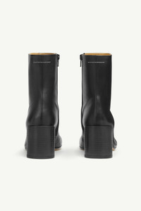 Anatomic ankle boots in nappa leather with a curved tonal heel and inner side zip. MM6’s discreet yet distinct signature, a horizontal line of white stitches, is present on the back of the shoes. 7 cm heel. Product Details Item ID S59WU0235P3628T8013 Upper: 100% ovine leather Lining: 100% calf leather Inside: 100% ovine leather Sole: 100% calf leather Heel height: 7 cm/2,8 in Anatomic ankle boots in nappa leather MM6 anatomic shape Cylindrical heel Zip closure on the inside White stitch line at the back Made in Spain