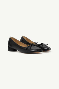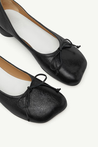 MM6 reinterprets the ballet pump with its signature anatomic toe and cylindrical tonal heel. Crafted in supple calf leather, the style is finished with a delicate bow at the front, balancing feminine detail with structural precision. Finished with the MM6 white stitch line at the back, underscoring its subversive identity. Product Details Item ID S59WZ0092P7561T8013 Upper: 100% calf leather Lining: 100% calf leather Inside: 100% calf leather Sole: 100% calf leather Contrast: 100% rubber Heel height: 2.5 cm Squared toe with bow detail White stitch line at the back Made in Italy