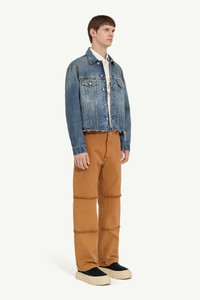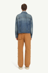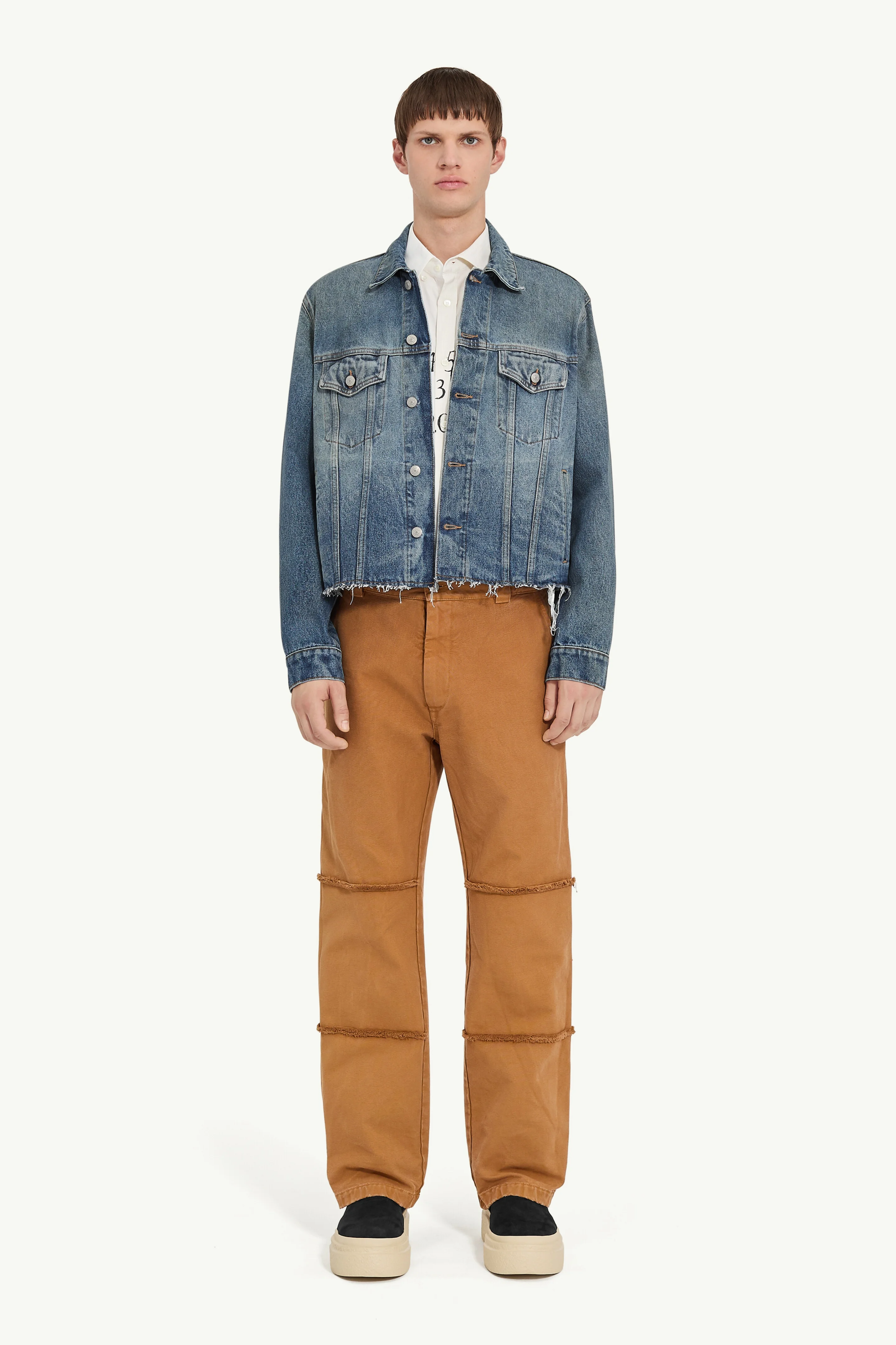 This blue denim jacket embodies MM6’s deconstructive design ethos with its raw-edge hem and deliberately undone details. The design features buttoned flap pockets and cuffs for a utilitarian touch, while the white stitch line at the back underscores the Maison’s distinctive identity. Product Details Item ID SH0AM0026M30018965 Primary fabric: 100% cotton Pocket lining: 65% polyester, 35% cotton Blue denim jacket Button closure Buttoned flap pockets Buttoned cuffs Raw-edge hem White stitch line at the back Made in Italy