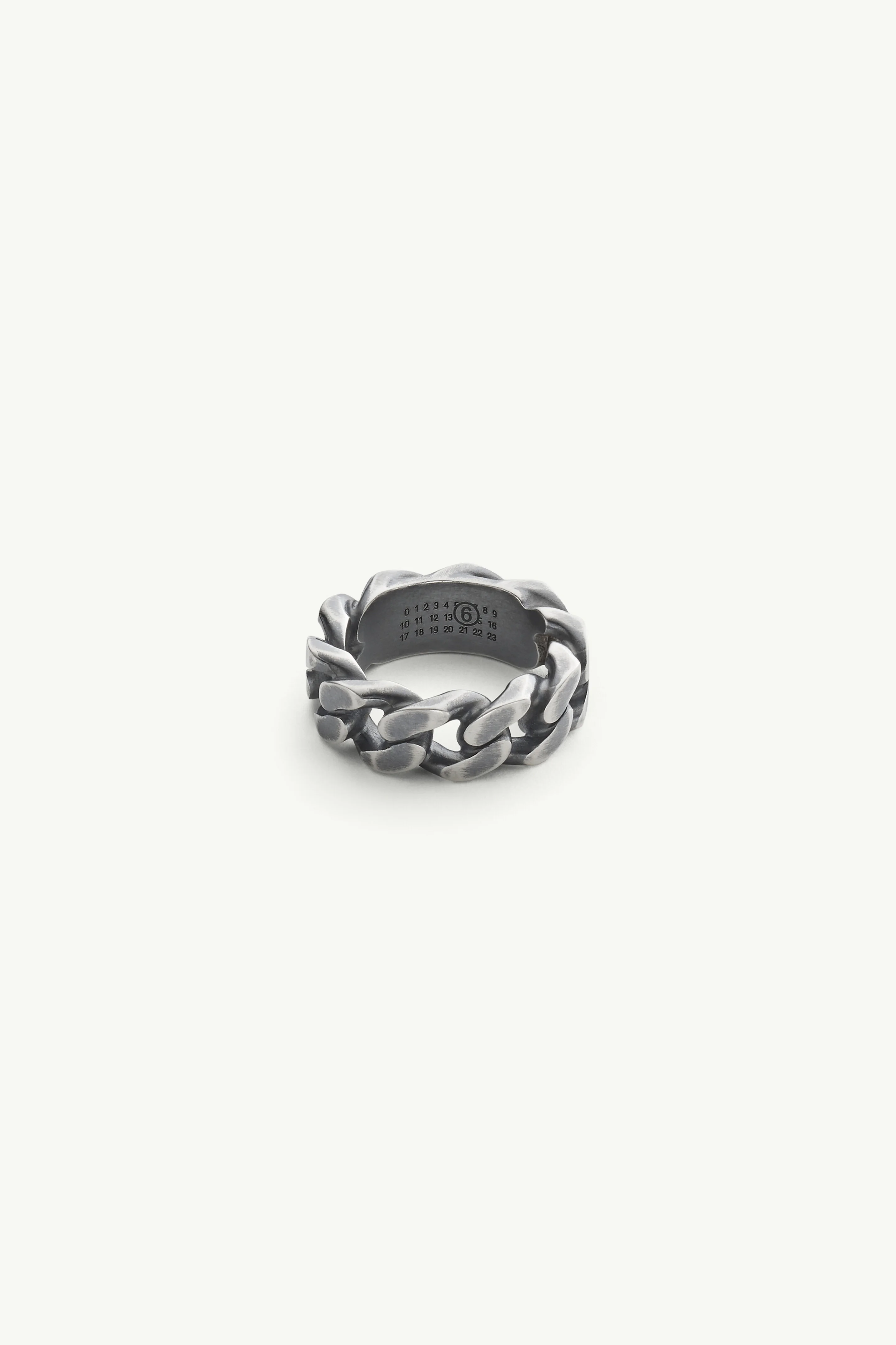Crafted in silver-tone metal, this ring reinterprets a classic chain-link with bold proportions. The smooth inner band is engraved with the MM6 numeric logo, balancing raw edge with refined detail. Product Details Item ID SM6UQ0111P8884954 Body: 100% brass One size Chain link ring in burnished brass Engraved brand logo on the interior Avoid salt, chlorine water and aggressive liquid Made in Italy