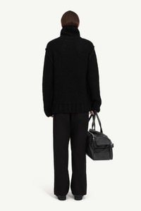 Cosy and tactile, this chunky turtleneck reflects MM6’s affinity for deconstructed silhouettes and homespun textures. Knitted in Italy from pure wool, it features exposed seam detailing, drop shoulders and exaggerated proportions – amplifying a sense of softness and scale. Product Details Item ID SH2HA0008M13166900 Primary fabric: 100% Wool Chunky knit turtleneck Exaggerated collar Drop shoulders Exposed seam detail Wide ribbed trims at the cuffs and hem Made in Italy Model is 186 cm tall and wears a size M.