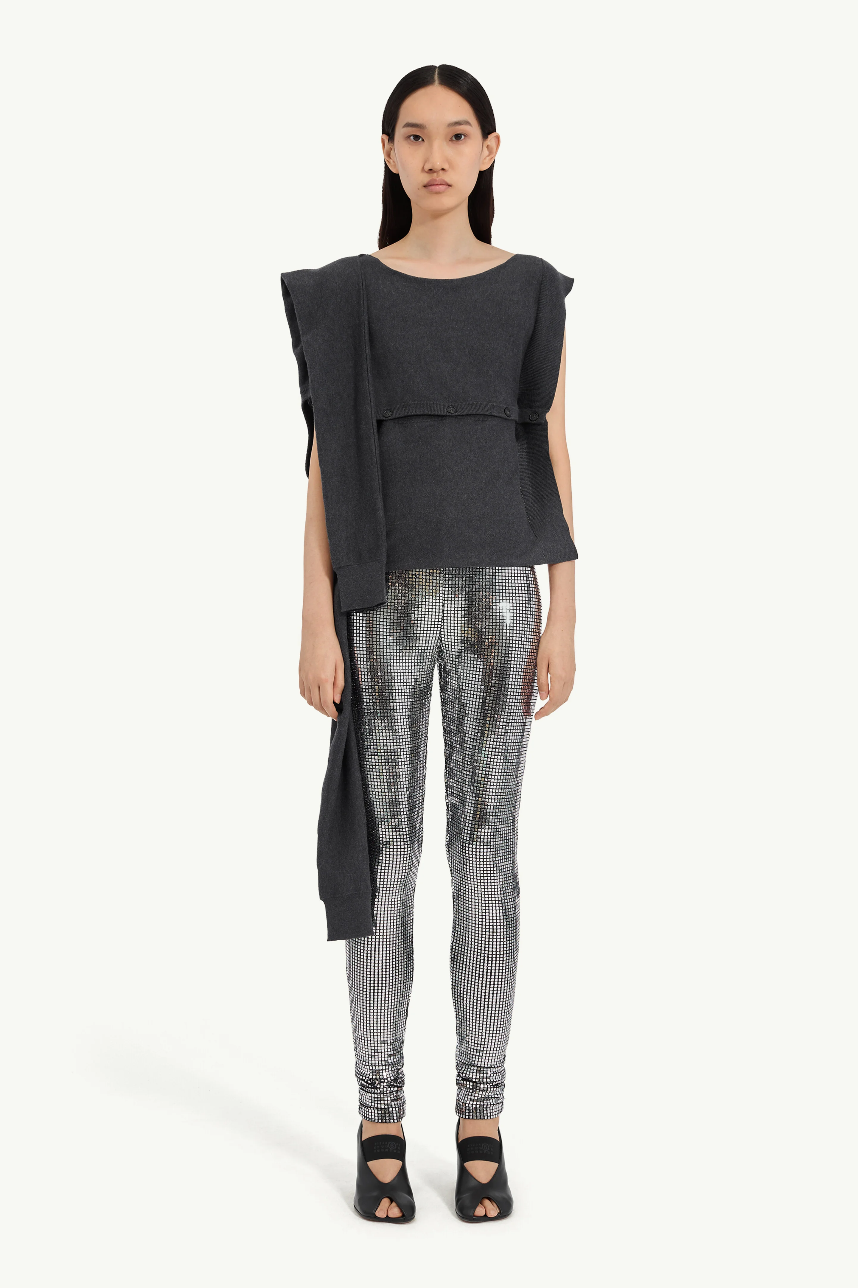 Fine-gauge knit top with a sideways construction, designed to shift between a classic cardigan silhouette and a draped, sculptural form. The buttoned panel enhances the fluidity, transforming function into design detail. At the back, the MM6 white stitch line asserts its signature. Product Details Item ID S52HP0035M13207855M Primary fabric: 100% cotton Gauge 14 Short sleeves Round neck Flat buttons closure at the front White stitch line at the back Made in Italy