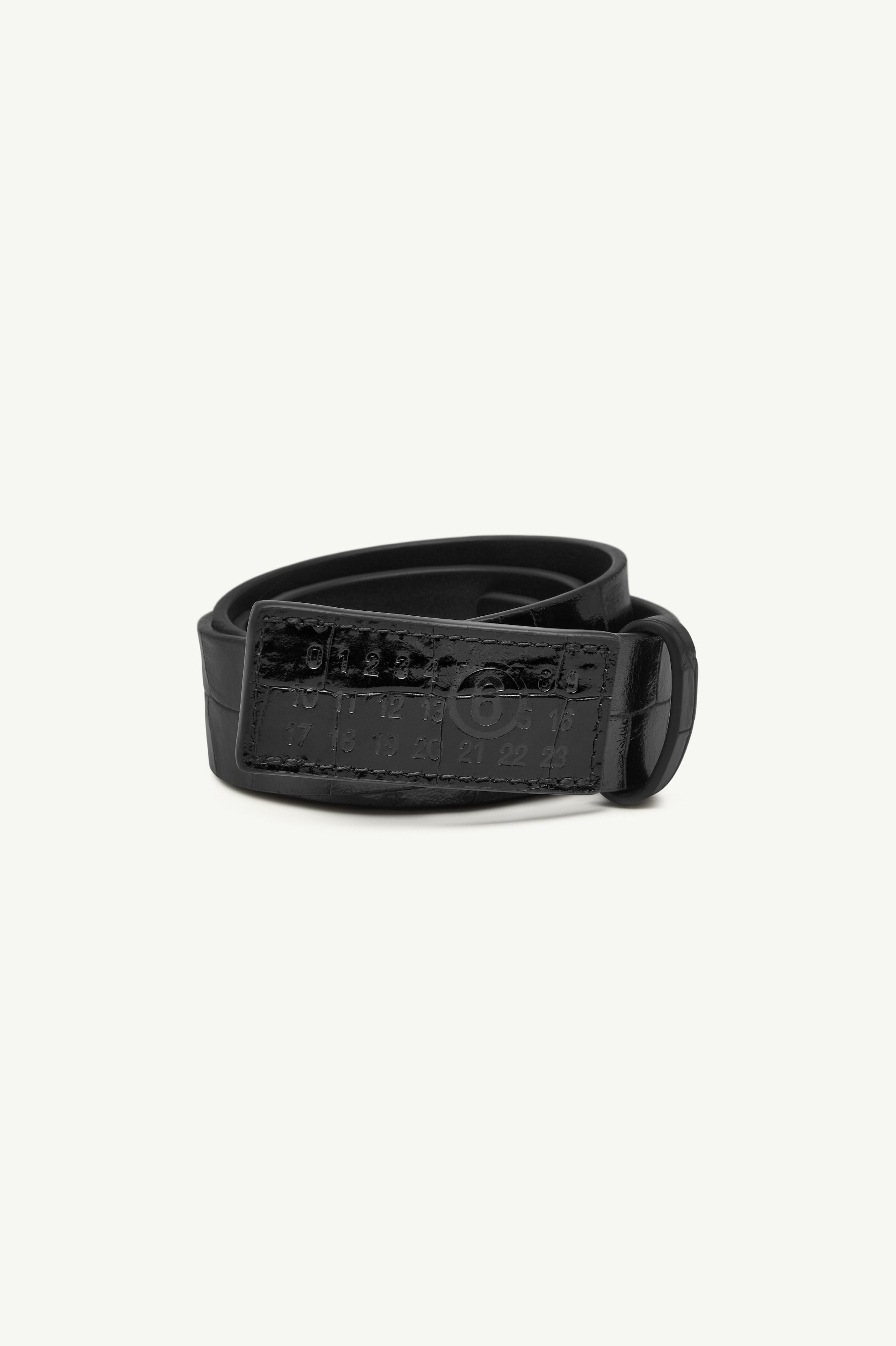 This croc-embossed belt is wrapped entirely in texture, its closure reduced to a discreet loop. Minimalist in construction and finish, the MM6 numeric signature is subtly stamped at the squared end – a quiet emblem of identity. Product Details Item ID SA6TP0047P8650T8013 Primary material: 100% Calf Leather Secondary material: 100% Calf Leather Metallic hardware Croc-print embossed belt Squared end Embossed numeric signature Made in Italy