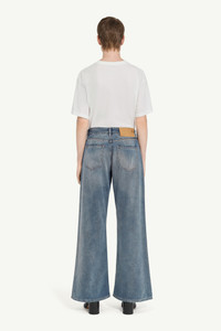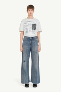 These jeans reflect MM6’s subversive style with their wide-leg design, disrupted by distressed detailing. Side pockets enhance their utilitarian edge, while the white stitch line and MM6 numeric artwork at the back underscore the brand’s distinctive, nonconformist spirit. Product Details Item ID S52LA0238M30017994 Composition: 100% cotton Pocket lining: 65% polyester, 35% cotton Blue denim 5-pocket trousers Regular waist Wide leg Zip and button closure White stitch line and MM6 numeric signature jacron label at the back Made in Italy