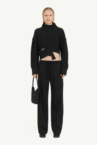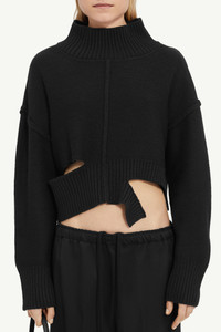Slouchy high-neck sweater knitted from a wool blend with distressed accents, exposed seams, ripped details and chunky ribbed trims. MM6’s discreet yet distinct signature, a horizontal line of white stitches, is also found on the back of the garment. Gauge 5 Product Details Item ID S52HA0285M13044900 Composition: 50% wool, 50% acrylic Gauge 5 Distressed knitted jumper Turtleneck Dropped shoulder Exposed seams Ribbed trims Ripped details White stitch line at the back Made in Italy Model is 5'8'' tall and wears a size M.