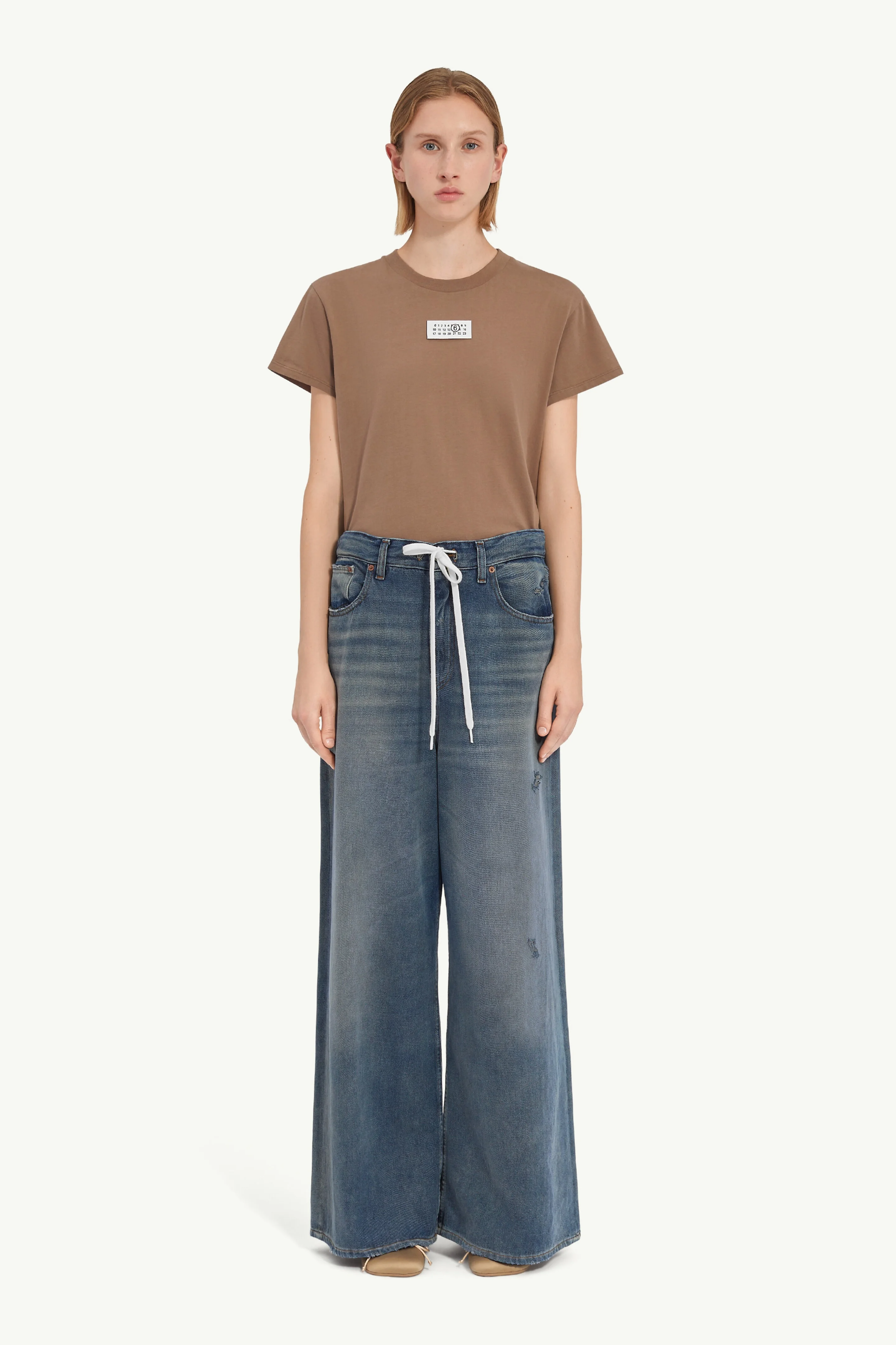These blue denim 5-pocket jeans embody MM6’s unconventional design ethos with their subversive wide-leg cut and off-white drawstring. Distressed details add a rebellious edge, while the white stitch line and numeric signature at the back affirm the Maison's distinctive identity. Product Details Item ID S52LA0246M30017994 Composition: 100% cotton Pocket lining: 65% polyester, 35% cotton Blue denim 5-pocket trousers Regular waist Wide leg Zip and button closure Off white drawstring White stitch line and MM6 numeric signature jacron label at the back Made in Italy